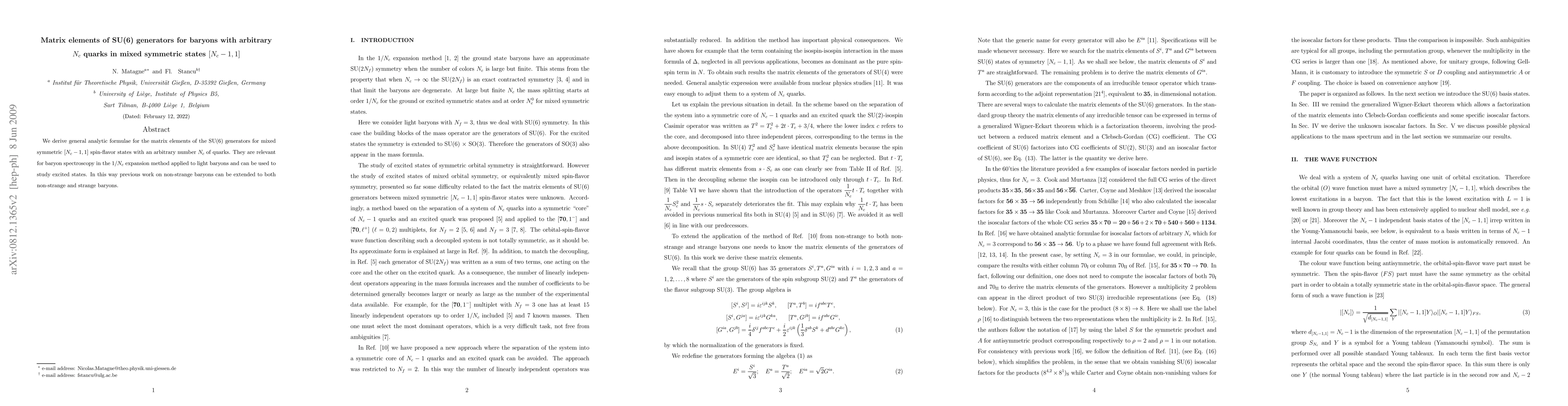 We derive general analytic formulae for the matrix elements of the SU(6) generators for mixed symmetric $[N_c-1,1]$ spin-flavor states with an arbitrary number $N_c$ of quarks. They are relevant for baryon spectroscopy in the $1/N_c$ expansion method applied to light baryons and can be used to study excited states. In this way previous work on non-strange baryons can be extended to both non-strange and strange baryons.