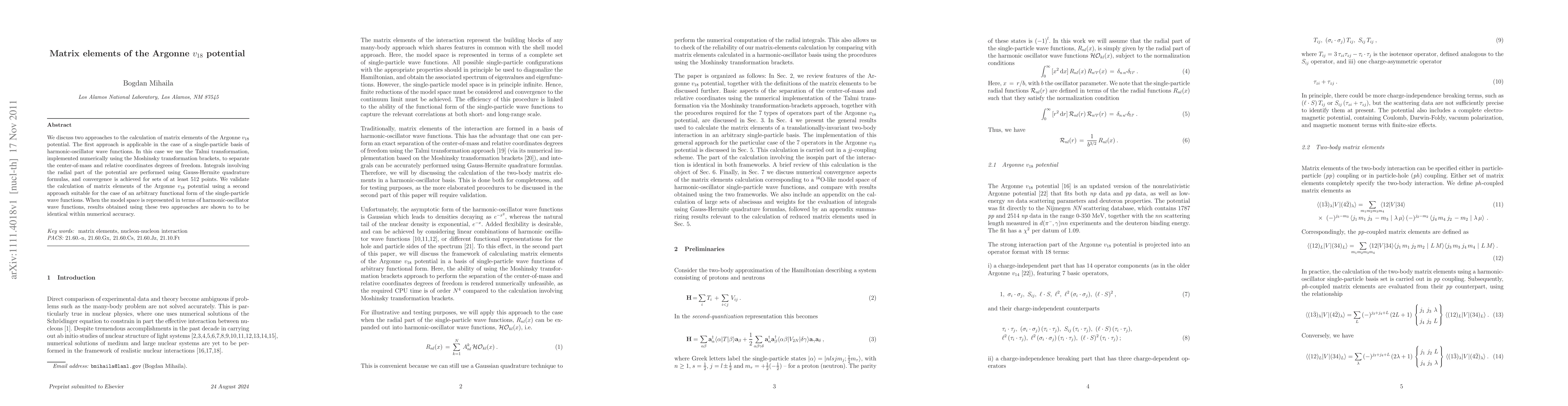 We discuss two approaches to the calculation of matrix elements of the Argonne v18 potential. The first approach is applicable in the case of a single-particle basis of harmonic-oscillator wave functions. In this case we use the Talmi transformation, implemented numerically using the Moshinsky transformation brackets, to separate the center-of-mass and relative coordinates degrees of freedom. Integrals involving the radial part of the potential are performed using Gauss-Hermite quadrature formulas, and convergence is achieved for sets of at least 512 points. We validate the calculation of matrix elements of the Argonne v18 potential using a second approach suitable for the case of an arbitrary functional form of the single-particle wave functions. When the model space is represented in terms of harmonic-oscillator wave functions, results obtained using these two approaches are shown to to be identical within numerical accuracy.