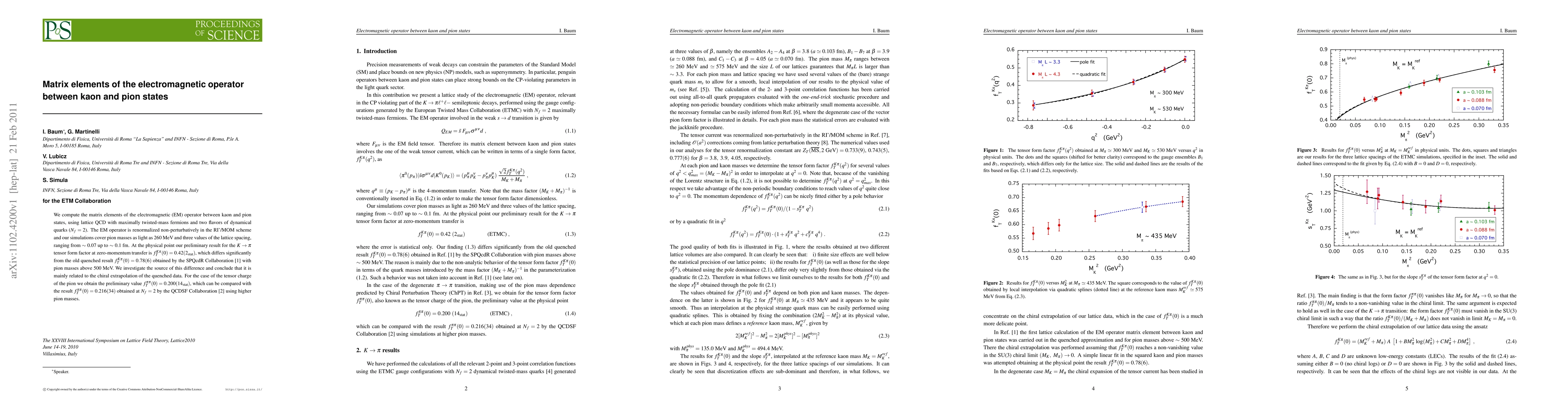This study computes matrix elements of the electromagnetic operator between kaon and pion states using lattice QCD. The research finds that the K -> pion tensor form factor at zero-momentum transfer is fT[Kπ](0) = 0.42(2_stat), contrasting with older quenched results. The discrepancy is attributed to chiral extrapolation differences. For the pion's tensor charge, the preliminary value obtained is fT[ππ](0) = 0.200(14_stat), compared to previous Nf = 2 results.