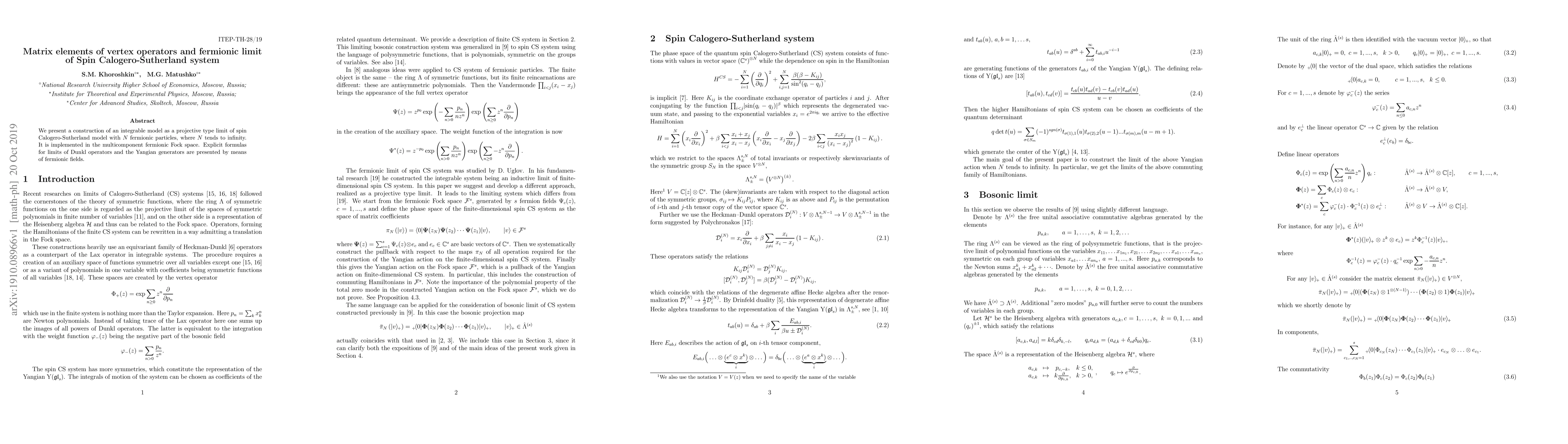 This paper constructs an integrable model by taking the fermionic limit of the spin Calogero-Sutherland system, presenting explicit formulas for Dunkl operators and Yangian generators via fermionic fields in multicomponent fermionic Fock space.