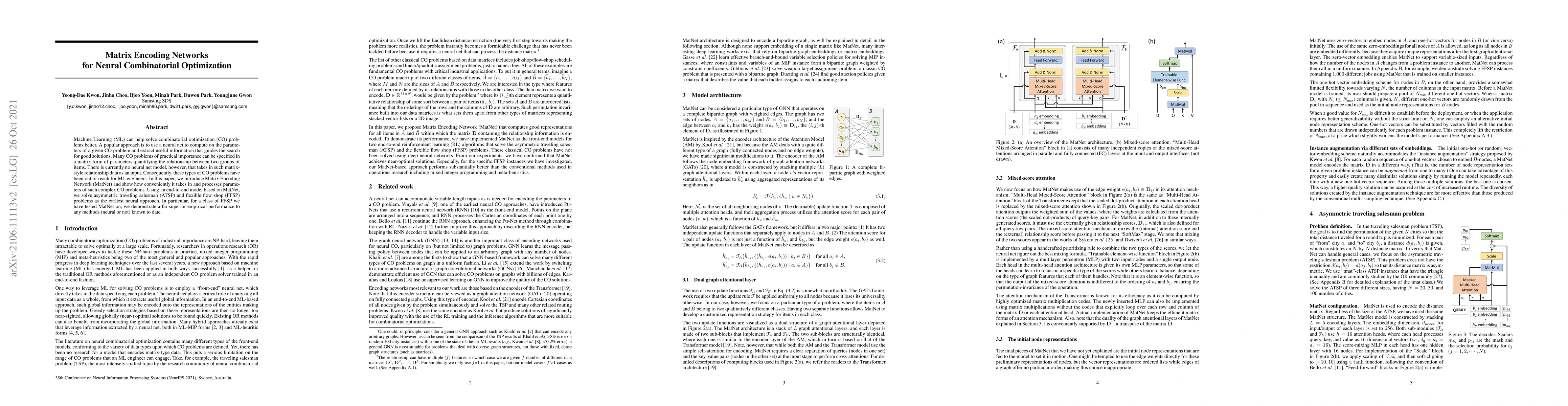 Machine Learning (ML) can help solve combinatorial optimization (CO) problems better. A popular approach is to use a neural net to compute on the parameters of a given CO problem and extract useful information that guides the search for good solutions. Many CO problems of practical importance can be specified in a matrix form of parameters quantifying the relationship between two groups of items. There is currently no neural net model, however, that takes in such matrix-style relationship data as an input. Consequently, these types of CO problems have been out of reach for ML engineers. In this paper, we introduce Matrix Encoding Network (MatNet) and show how conveniently it takes in and processes parameters of such complex CO problems. Using an end-to-end model based on MatNet, we solve asymmetric traveling salesman (ATSP) and flexible flow shop (FFSP) problems as the earliest neural approach. In particular, for a class of FFSP we have tested MatNet on, we demonstrate a far superior empirical performance to any methods (neural or not) known to date.