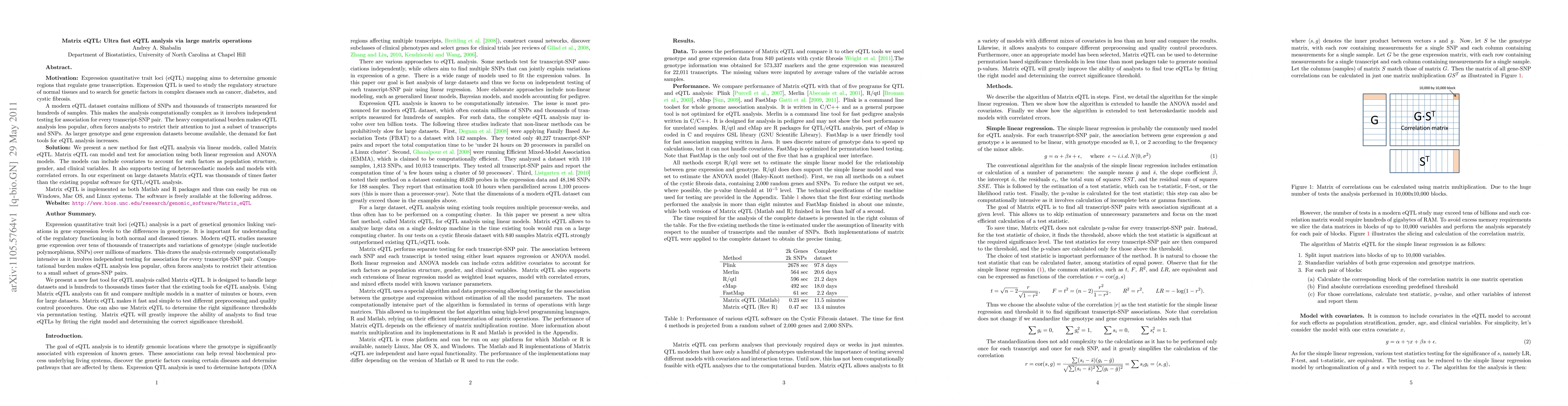 The paper introduces Matrix eQTL, a fast eQTL analysis method using large matrix operations, which significantly speeds up the computationally intensive process of mapping genomic regions to gene transcription regulation. The software is both efficient and versatile, supporting various models and covariates, and is available for multiple operating systems.