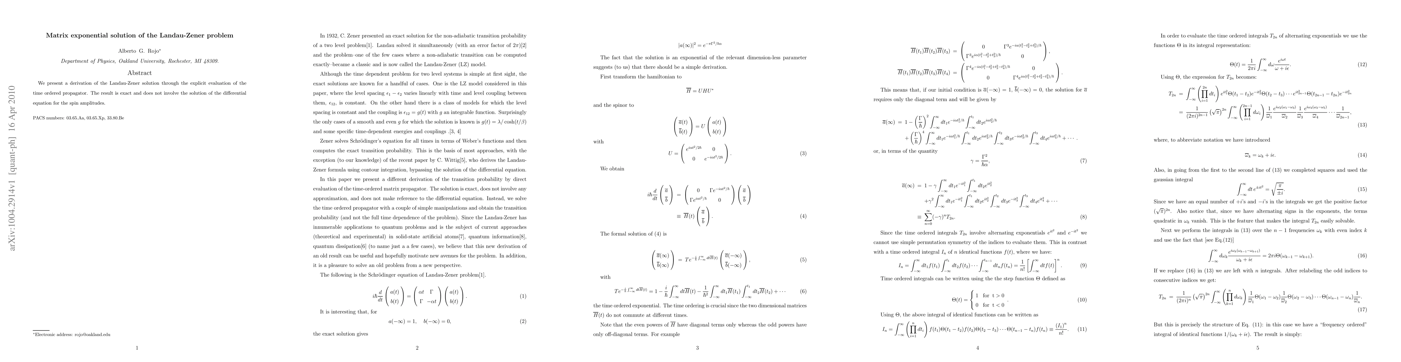 Summary: This paper derives the Landau-Zener solution using matrix exponentials and the time-ordered propagator, providing an exact method that avoids solving the differential equation for spin amplitudes. The approach offers a novel perspective on the problem without relying on traditional methods.