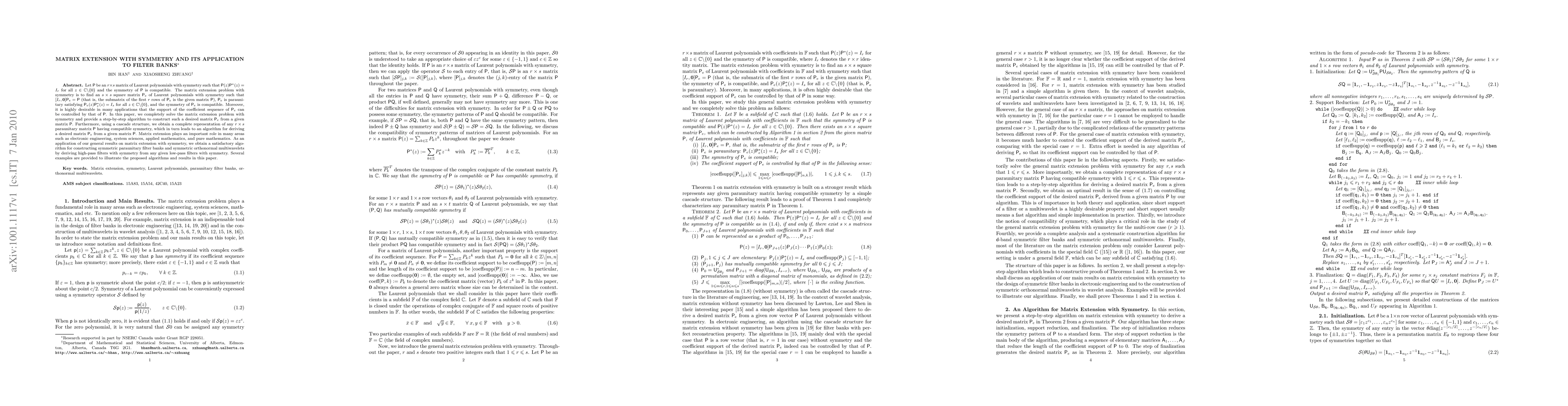 This paper presents a complete solution to the matrix extension problem with symmetry, providing a step-by-step algorithm for constructing a desired matrix from a given one. It also applies this method to develop algorithms for constructing symmetric paraunitary filter banks and symmetric orthonormal multiwavelets.