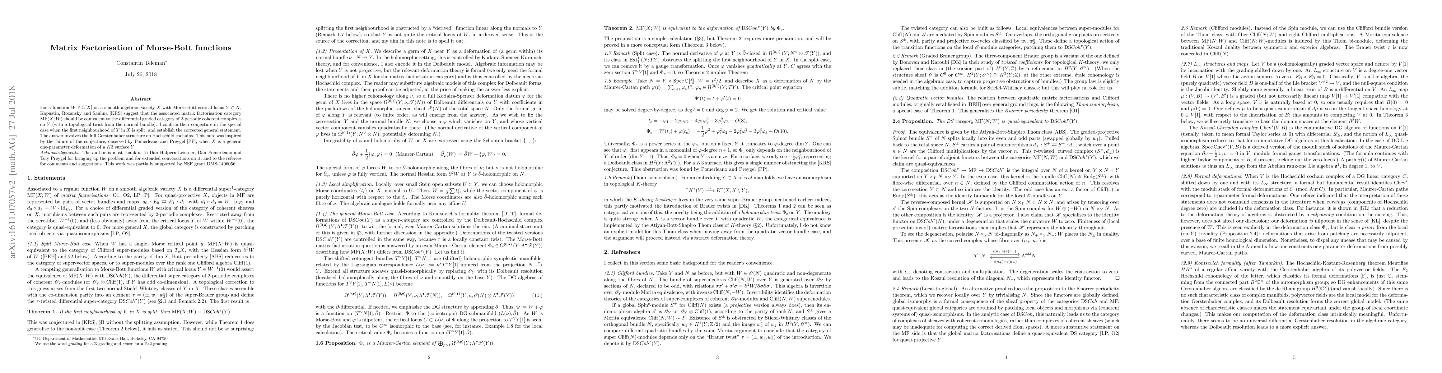 For a function $W\in \mathbb{C}[X]$ on a smooth algebraic variety $X$ with Morse-Bott critical locus $Y\subset X$, Kapustin, Rozansky and Saulina suggest that the associated matrix factorisation category $\mathrm{MF}(X;W)$ should be equivalent to the differential graded category of $2$-periodic coherent complexes on $Y$ (with a topological twist from the normal bundle of $Y$). I confirm their conjecture in the special case when the first neighbourhood of $Y$ in $X$ is split, and establish the corrected general statement. The answer involves the full Gerstenhaber structure on Hochschild cochains. This note was inspired by the failure of the conjecture, observed by Pomerleano and Preygel, when $X$ is a general one-parameter deformation of a $K3$ surface $Y$.