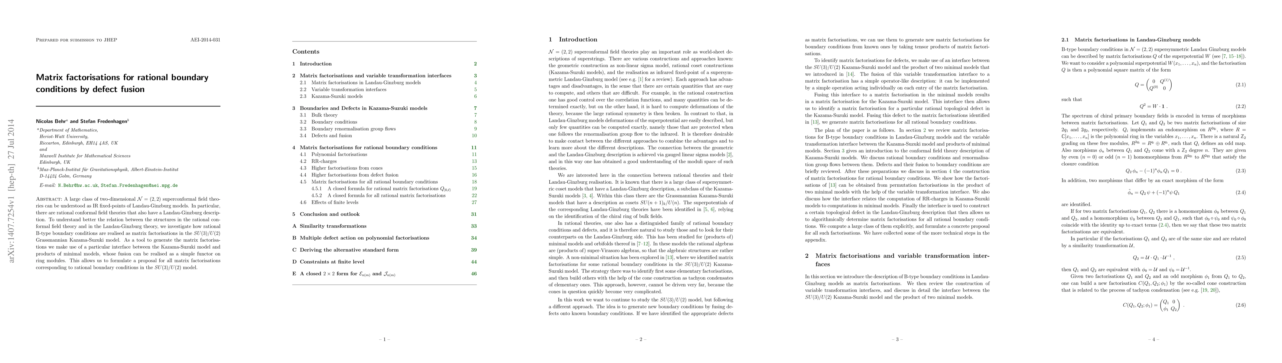 A large class of two-dimensional $\mathcal{N}=(2,2)$ superconformal field theories can be understood as IR fixed-points of Landau-Ginzburg models. In particular, there are rational conformal field theories that also have a Landau-Ginzburg description. To understand better the relation between the structures in the rational conformal field theory and in the Landau-Ginzburg theory, we investigate how rational B-type boundary conditions are realised as matrix factorisations in the $SU(3)/U(2)$ Grassmannian Kazama-Suzuki model. As a tool to generate the matrix factorisations we make use of a particular interface between the Kazama-Suzuki model and products of minimal models, whose fusion can be realised as a simple functor on ring modules. This allows us to formulate a proposal for all matrix factorisations corresponding to rational boundary conditions in the $SU(3)/U(2)$ model.