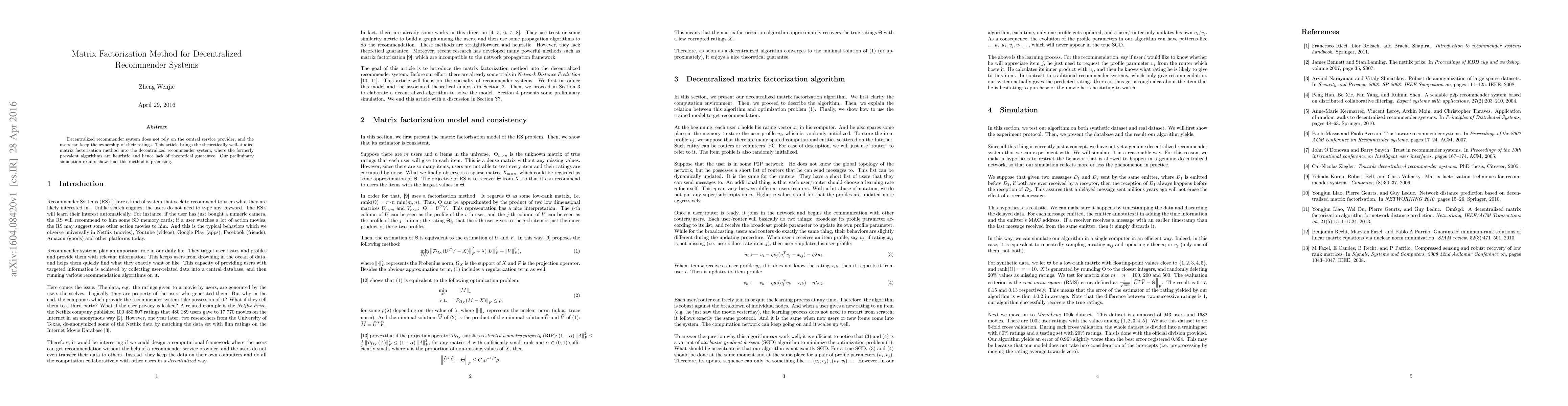 This paper introduces a matrix factorization method for decentralized recommender systems, allowing users to retain ownership of their ratings without relying on a central service provider. Preliminary simulations indicate promising results, offering a theoretically grounded alternative to heuristic algorithms.