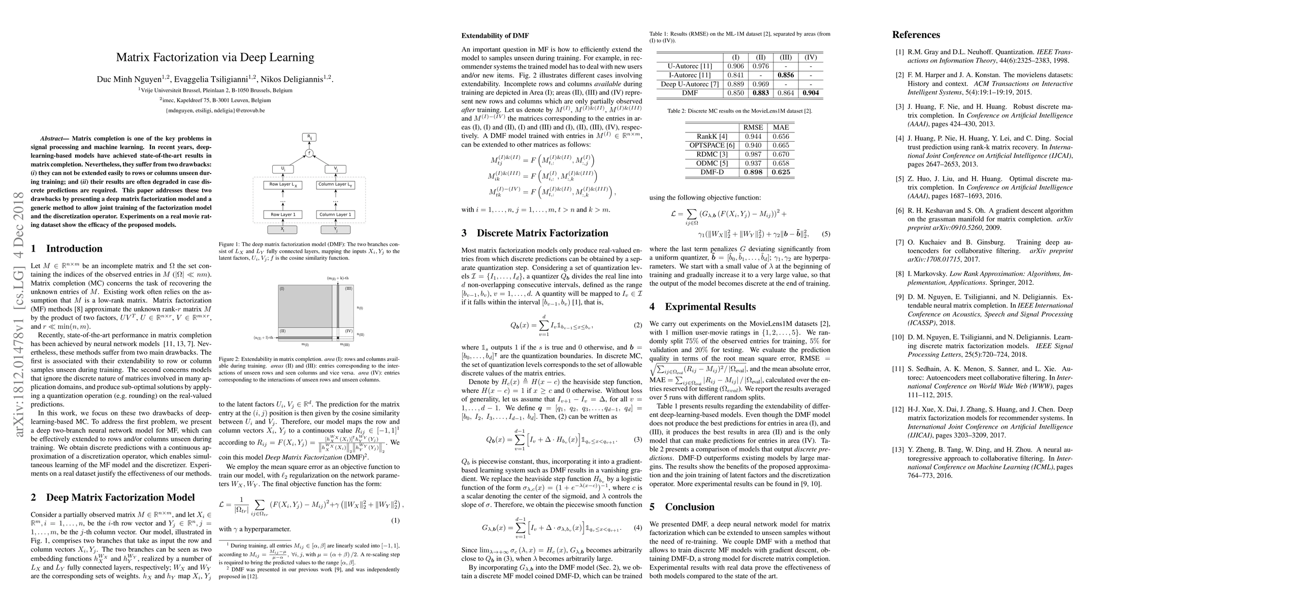 This paper proposes a deep matrix factorization model to improve matrix completion, addressing the limitations of existing deep-learning models by enabling joint training with a discretization operator, thus enhancing performance on unseen rows or columns and discrete predictions. Experiments on a movie rating dataset demonstrate the effectiveness of the proposed approach.