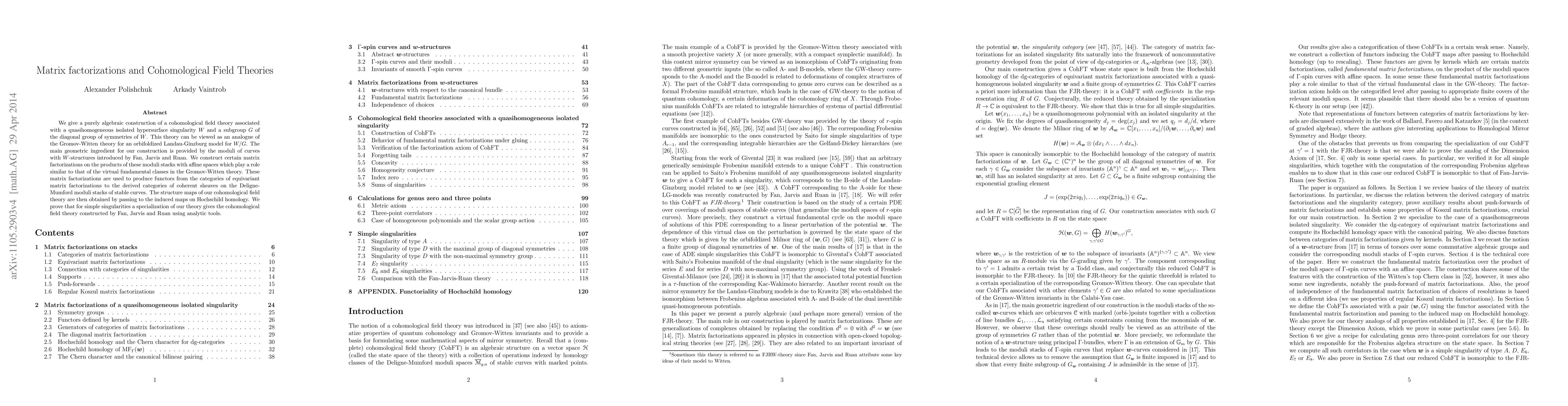 We give a purely algebraic construction of a cohomological field theory associated with a quasihomogeneous isolated hypersurface singularity W and a subgroup G of the diagonal group of symmetries of W. This theory can be viewed as an analogue of the Gromov-Witten theory for an orbifoldized Landau-Ginzburg model for W/G. The main geometric ingredient for our construction is provided by the moduli of curves with W-structures introduced by Fan, Jarvis and Ruan. We construct certain matrix factorizations on the products of these moduli stacks with affine spaces which play a role similar to that of the virtual fundamental classes in the Gromov-Witten theory. These matrix factorizations are used to produce functors from the categories of equivariant matrix factorizations to the derived categories of coherent sheaves on the Deligne-Mumford moduli stacks of stable curves. The structure maps of our cohomological field theory are then obtained by passing to the induced maps on Hochschild homology. We prove that for simple singularities a specialization of our theory gives the cohomological field theory constructed by Fan, Jarvis and Ruan using analytic tools.