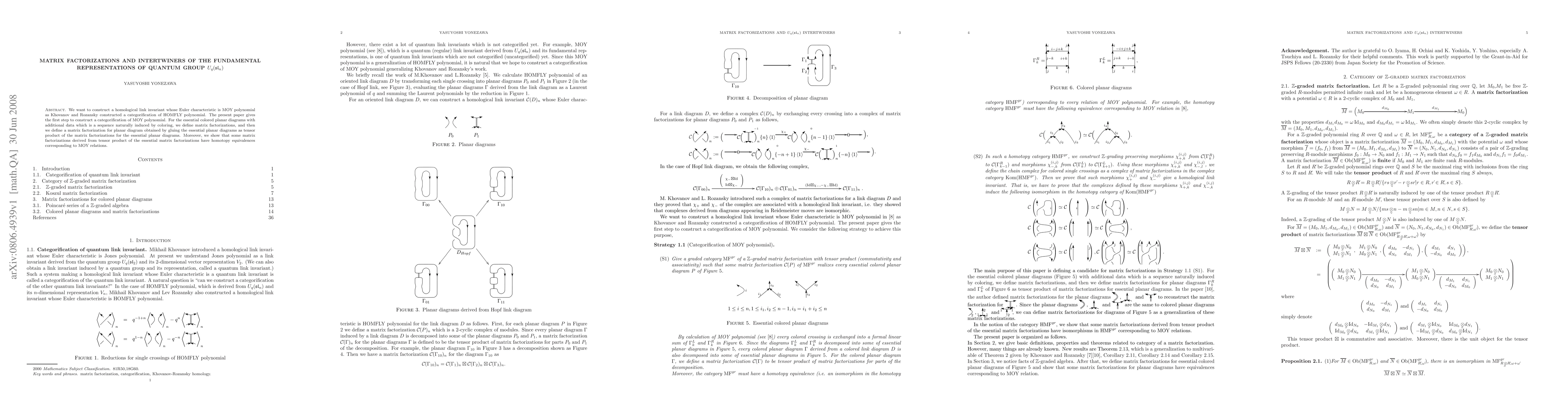 We want to construct a homological link invariant whose Euler characteristic is MOY polynomial as Khovanov and Rozansky constructed a categorification of HOMFLY polynomial. The present paper gives the first step to construct a categorification of MOY polynomial. For the essential colored planar diagrams with additional data which is a sequence naturally induced by coloring, we define matrix factorizations, and then we define a matrix factorization for planar diagram obtained by gluing the essential colored planar diagrams as tensor product of the matrix factorizations for the essential planar diagrams. Moreover, we show that some matrix factorizations deribed from tensor product of the essential matrix factorizations have homotopy equivalences corresponding to MOY relations.