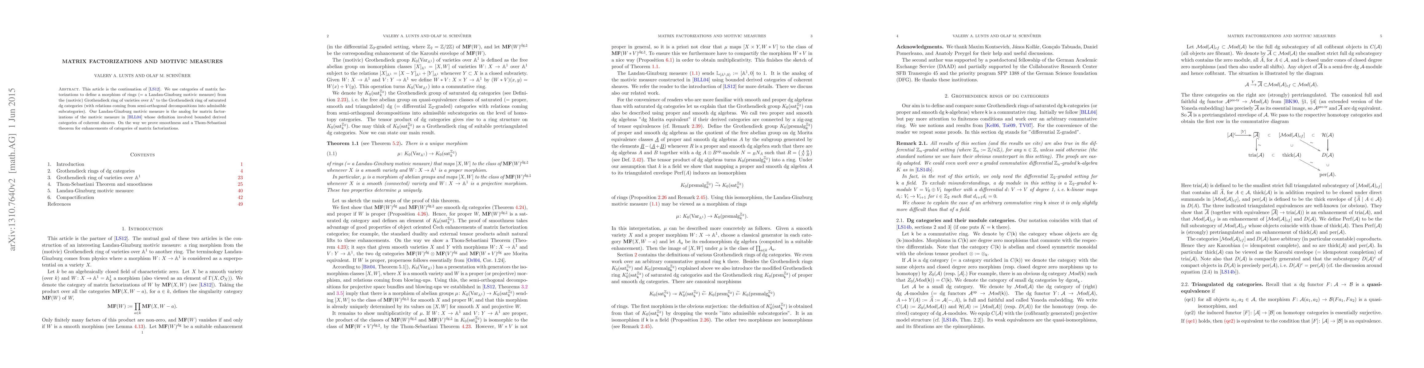 This paper extends previous work by defining a Landau-Ginzburg motivic measure using categories of matrix factorizations, and establishing smoothness and a Thom-Sebastiani theorem for these categories, analogous to the motivic measure defined in [BLL04] via derived categories of coherent sheaves.