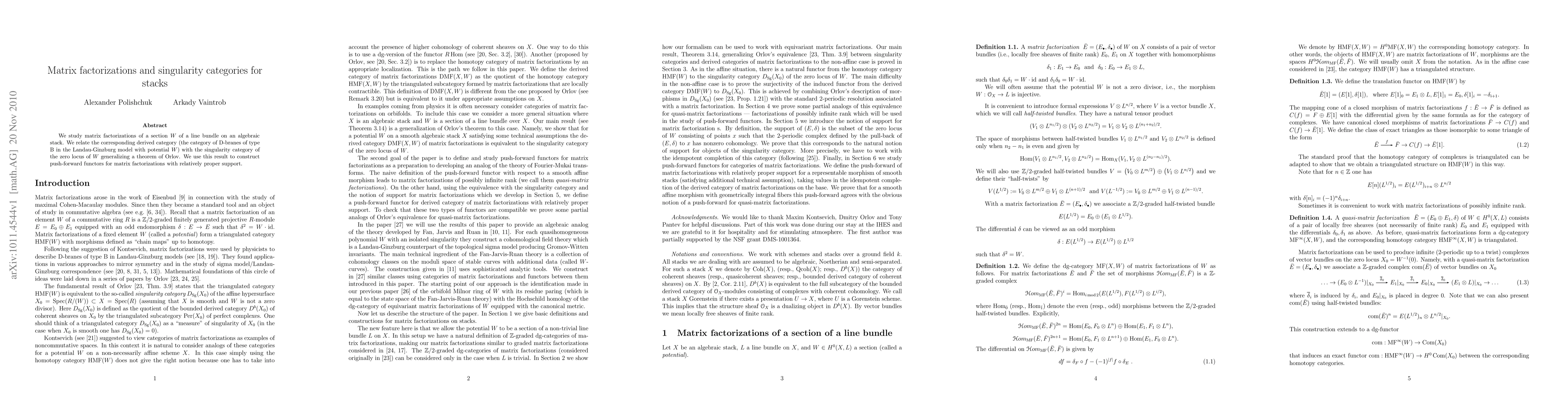 We study matrix factorizations of a section W of a line bundle on an algebraic stack. We relate the corresponding derived category (the category of D-branes of type B in the Landau-Ginzburg model with potential W) with the singularity category of the zero locus of W generalizing a theorem of Orlov. We use this result to construct push-forward functors for matrix factorizations with relatively proper support.
