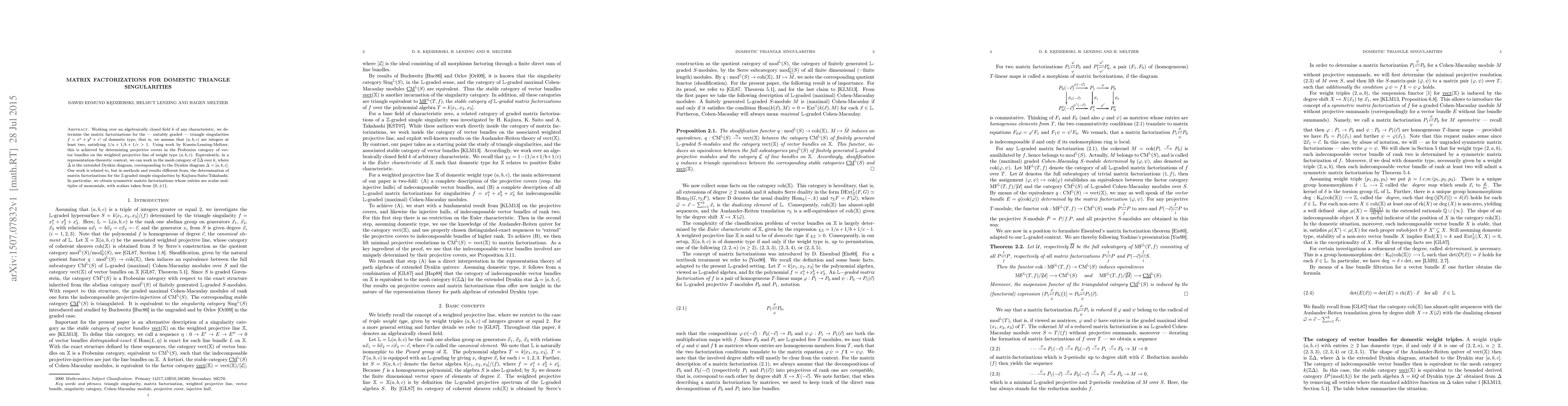 Working over an algebraically closed field $k$ of any characteristic, we determine the matrix factorizations for the --- suitably graded --- triangle singularities $f=x^a+y^b+z^c$ of domestic type, that is, we assume that $(a,b,c)$ are integers at least two, satisfying $1/a+1/b+1/c>1$. Using work by Kussin-Lenzing-Meltzer, this is achieved by determining projective covers in the Frobenius category of vector bundles on the weighted projective line of weight type $(a,b,c)$. Equivalently, in a representation-theoretic context, we can work in the mesh category of $\mathbb{Z}\tilde\Delta$ over $k$, where $\tilde\Delta$ is the extended Dynkin diagram, corresponding to the Dynkin diagram $\Delta=[a,b,c]$. Our work is related to, but in methods and results different from, the determination of matrix factorizations for the $\mathbb{Z}$-graded simple singularities by Kajiura-Saito-Takahashi. In particular, we obtain symmetric matrix factorizations whose entries are scalar multiples of monomials, with scalars taken from $\{0,\pm1\}$.