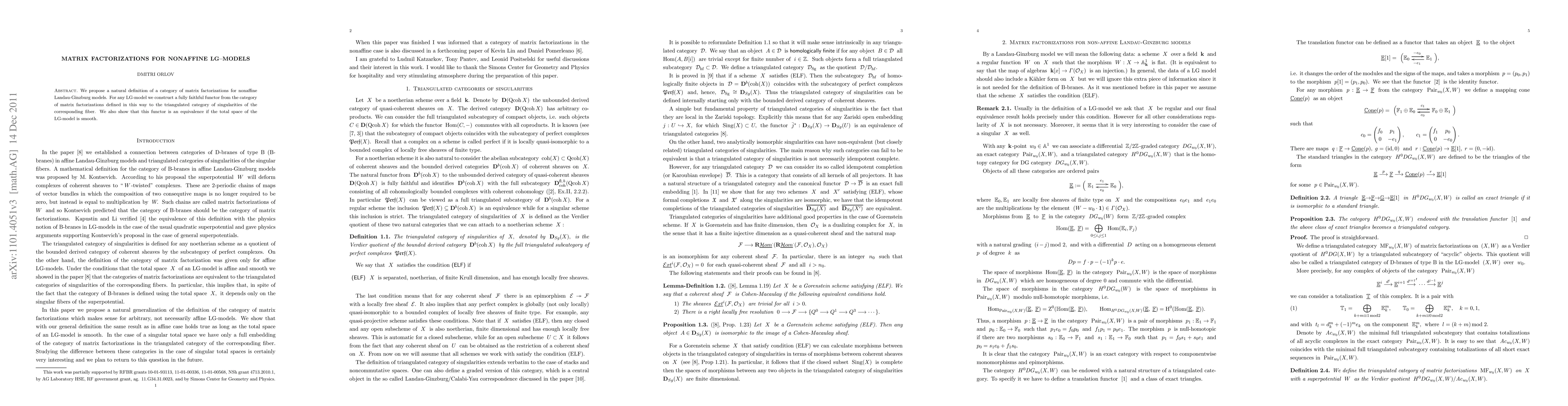 We propose a natural definition of a category of matrix factorizations for nonaffine Landau-Ginzburg models. For any LG-model we construct a fully faithful functor from the category of matrix factorizations defined in this way to the triangulated category of singularities of the corresponding fiber. We also show that this functor is an equivalence if the total space of the LG-model is smooth.