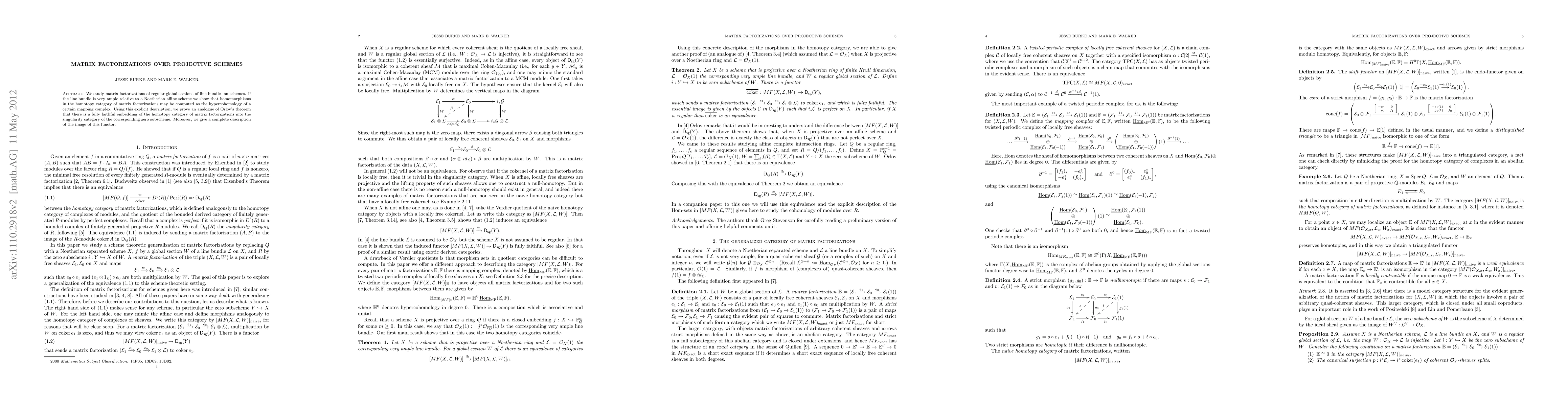 We study matrix factorizations of locally free coherent sheaves on a scheme. For a scheme that is projective over an affine scheme, we show that homomorphisms in the homotopy category of matrix factorizations may be computed as the hypercohomology of a certain mapping complex. Using this explicit description, we give another proof of Orlov's theorem that there is a fully faithful embedding of the homotopy category of matrix factorizations into the singularity category of the corresponding zero subscheme. We also give a complete description of the image of this functor.