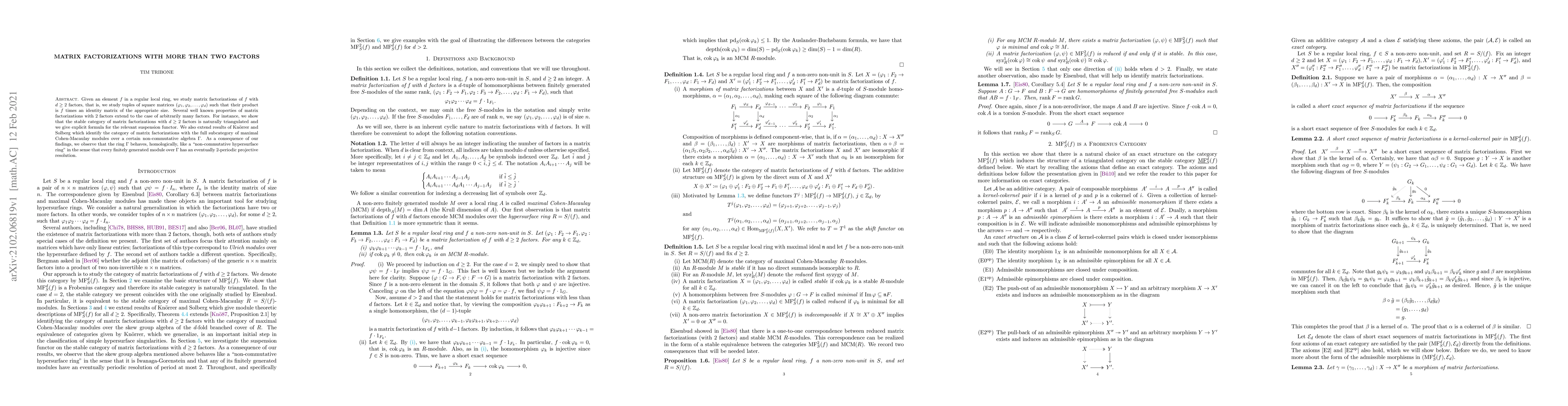 Given an element $f$ in a regular local ring, we study matrix factorizations of $f$ with $d \ge 2$ factors, that is, we study tuples of square matrices $(\varphi_1,\varphi_2,\dots,\varphi_d)$ such that their product is $f$ times an identity matrix of the appropriate size. Several well known properties of matrix factorizations with $2$ factors extend to the case of arbitrarily many factors. For instance, we show that the stable category of matrix factorizations with $d\ge 2$ factors is naturally triangulated and we give explicit formula for the relevant suspension functor. We also extend results of Kn\"orrer and Solberg which identify the category of matrix factorizations with the full subcategory of maximal Cohen-Macaulay modules over a certain non-commutative algebra $\Gamma$. As a consequence of our findings, we observe that the ring $\Gamma$ behaves, homologically, like a "non-commutative hypersurface ring" in the sense that every finitely generated module over $\Gamma$ has an eventually $2$-periodic projective resolution.