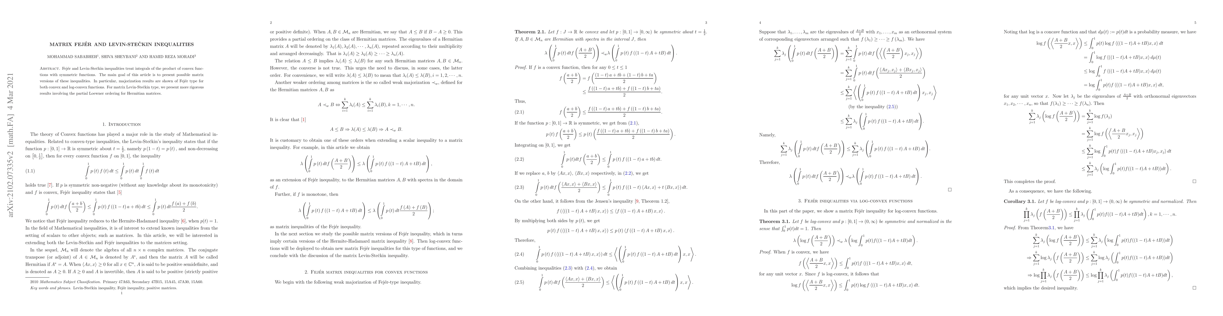 This paper explores matrix versions of the classical Fejér and Levin-Stećkin inequalities, focusing on majorization results for convex and log-convex functions, and presenting rigorous results for matrix Levin-Stećkin inequalities using the partial Loewner ordering for Hermitian matrices.
