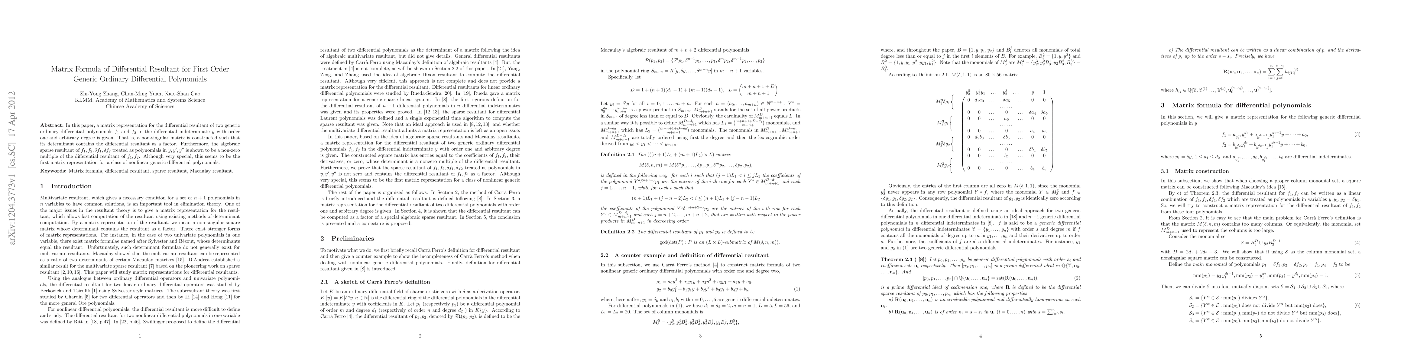 Researchers developed a matrix representation for the differential resultant of generic ordinary differential polynomials, revealing a connection between algebraic sparse resultant and differential resultant.
