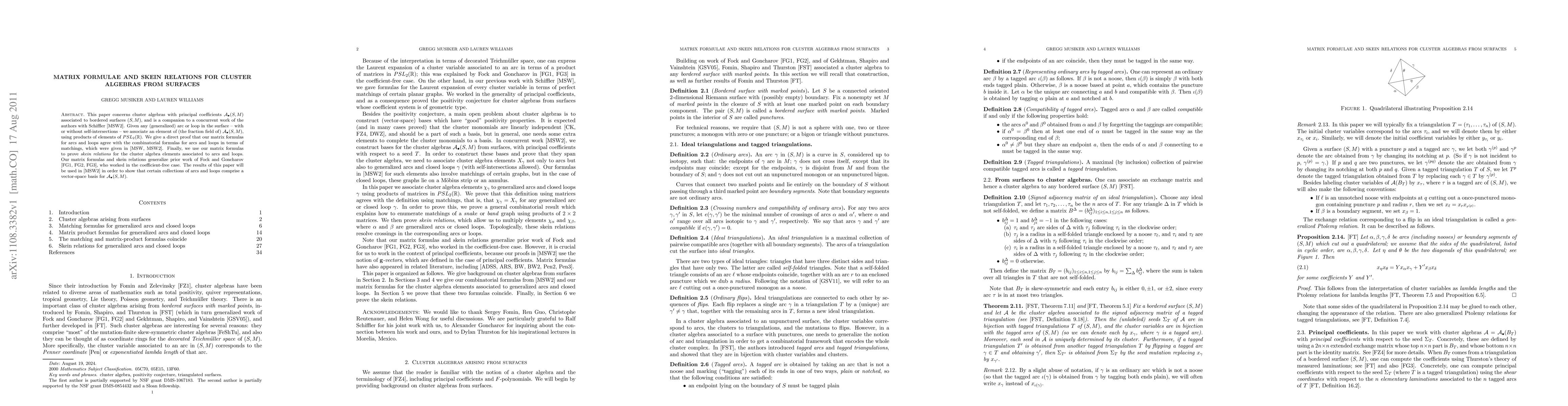 This paper concerns cluster algebras with principal coefficients A(S,M) associated to bordered surfaces (S,M), and is a companion to a concurrent work of the authors with Schiffler [MSW2]. Given any (generalized) arc or loop in the surface -- with or without self-intersections -- we associate an element of (the fraction field of) A(S,M), using products of elements of PSL_2(R). We give a direct proof that our matrix formulas for arcs and loops agree with the combinatorial formulas for arcs and loops in terms of matchings, which were given in [MSW, MSW2]. Finally, we use our matrix formulas to prove skein relations for the cluster algebra elements associated to arcs and loops. Our matrix formulas and skein relations generalize prior work of Fock and Goncharov [FG1, FG2, FG3], who worked in the coefficient-free case. The results of this paper will be used in [MSW2] in order to show that certain collections of arcs and loops comprise a vector-space basis for A(S,M).