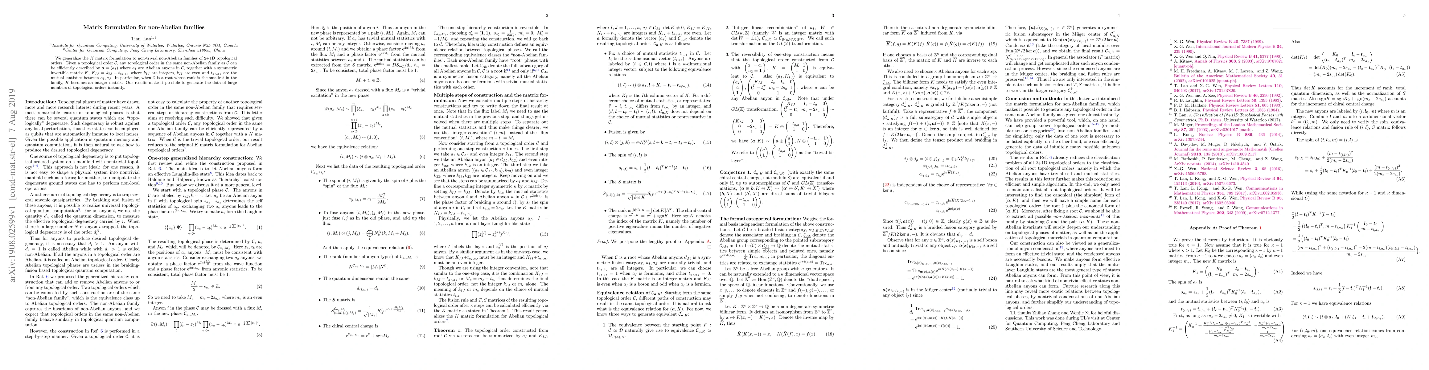 This paper generalizes the $K$ matrix formulation to describe non-Abelian families of 2+1D topological orders using Abelian anyons and a symmetric invertible matrix $K$. The matrix $K$ encapsulates the mutual statistics between anyons, enabling the efficient description of topological orders within the same family.
