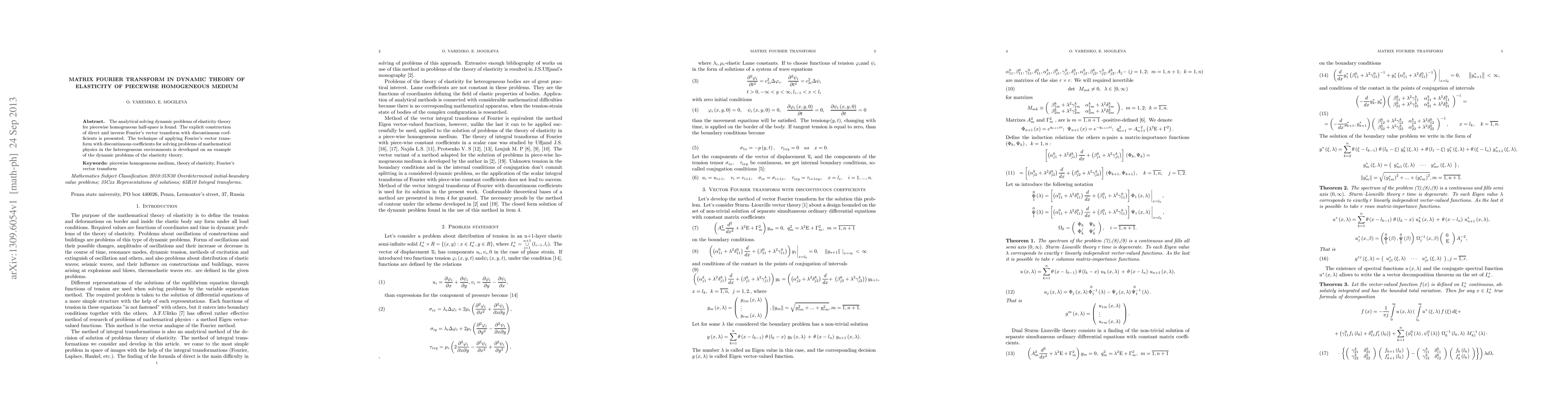 The analytical solving dynamic problems of elasticity theory for piecewise homogeneous half-space is found. The explicit construction of direct and inverse Fourier's vector transform with discontinuous coefficients is presented. The technique of applying Fourier's vector transform with discontinuous coefficients for solving problems of mathematical physics in the heterogeneous environments is developed on an example of the dynamic problems of the elasticity theory.