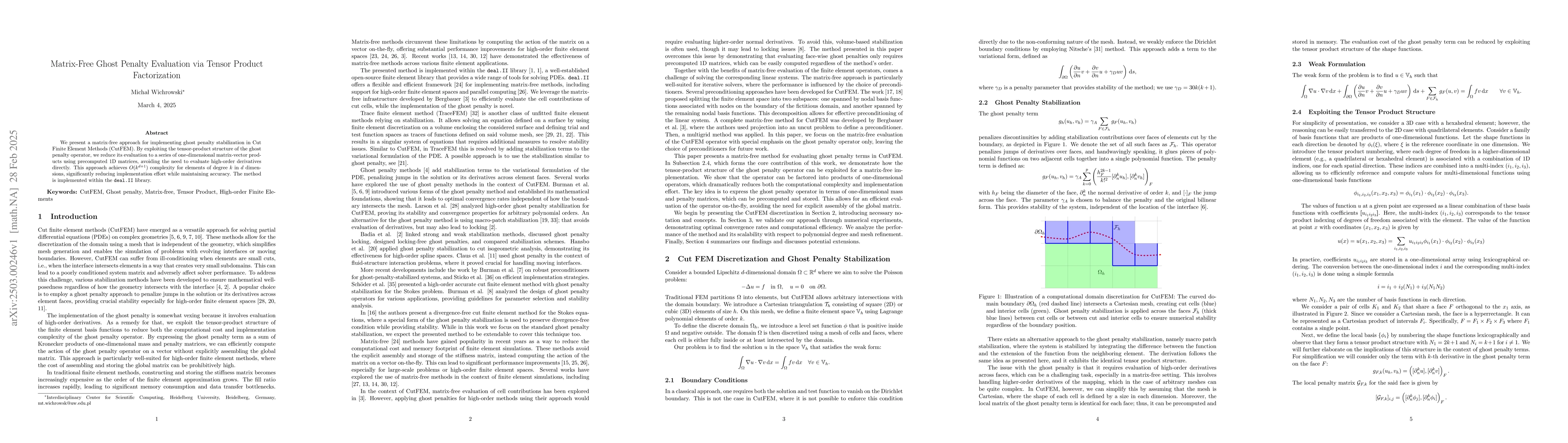 The paper presents a matrix-free approach for implementing ghost penalty stabilization in Cut Finite Element Methods (CutFEM) by exploiting the tensor-product structure of the ghost penalty operator, reducing its evaluation to a series of one-dimensional matrix-vector products using precomputed 1D matrices.