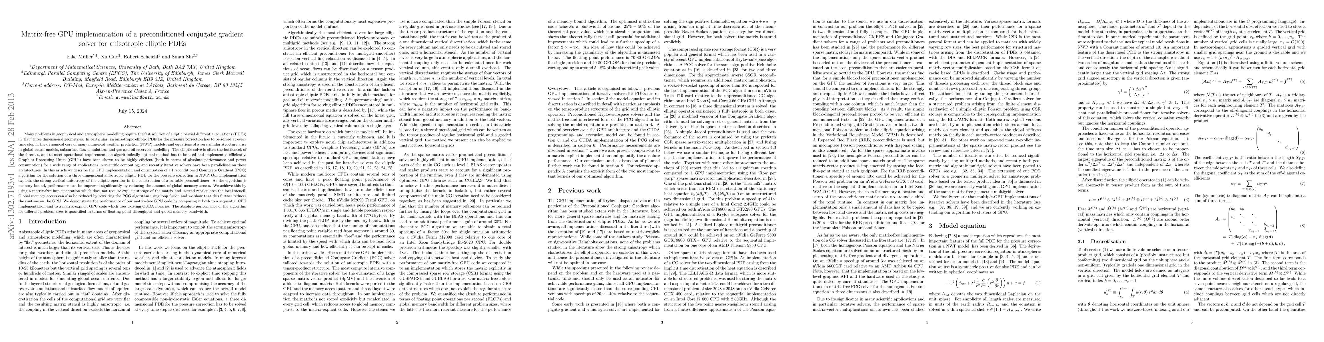 This paper presents a GPU implementation of a Preconditioned Conjugate Gradient solver for anisotropic elliptic PDEs, focusing on the pressure correction in numerical weather prediction models. The matrix-free approach minimizes memory access, and loop fusion further optimizes performance, demonstrating significant speedups compared to CPU and explicit GPU implementations.