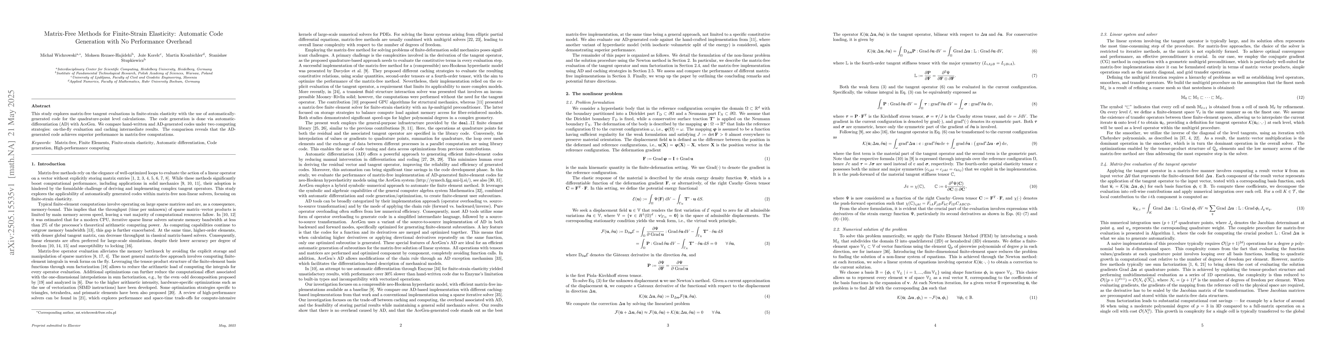 Researchers developed automatic code generation for matrix-free methods in finite-strain elasticity using automatic differentiation, outperforming hand-written codes in computing strategies.
