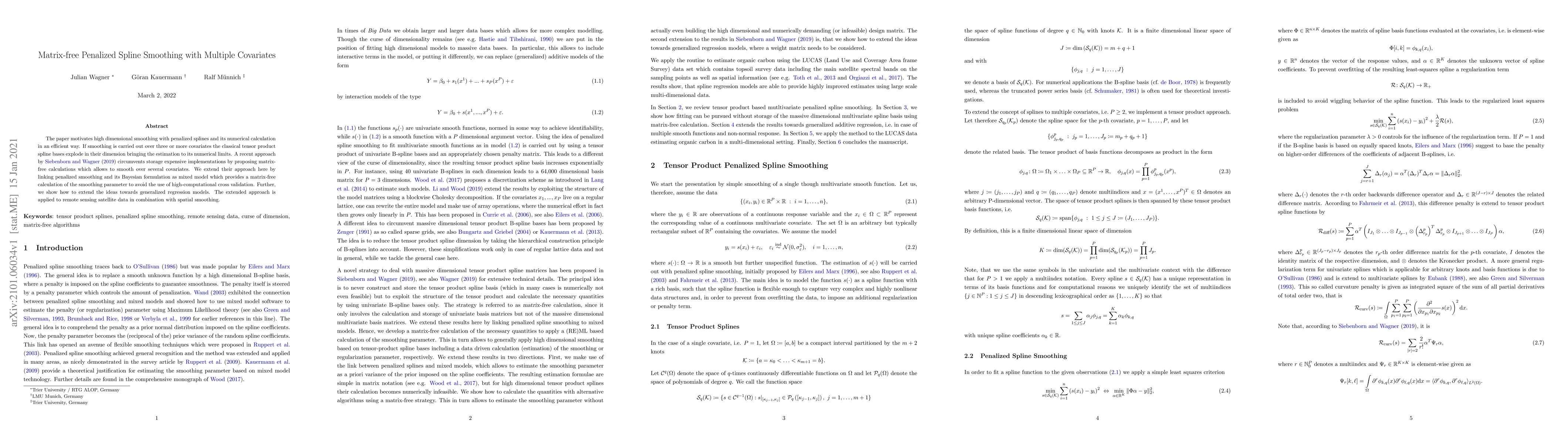 The paper motivates high dimensional smoothing with penalized splines and its numerical calculation in an efficient way. If smoothing is carried out over three or more covariates the classical tensor product spline bases explode in their dimension bringing the estimation to its numerical limits. A recent approach by Siebenborn and Wagner(2019) circumvents storage expensive implementations by proposing matrix-free calculations which allows to smooth over several covariates. We extend their approach here by linking penalized smoothing and its Bayesian formulation as mixed model which provides a matrix-free calculation of the smoothing parameter to avoid the use of high-computational cross validation. Further, we show how to extend the ideas towards generalized regression models. The extended approach is applied to remote sensing satellite data in combination with spatial smoothing.