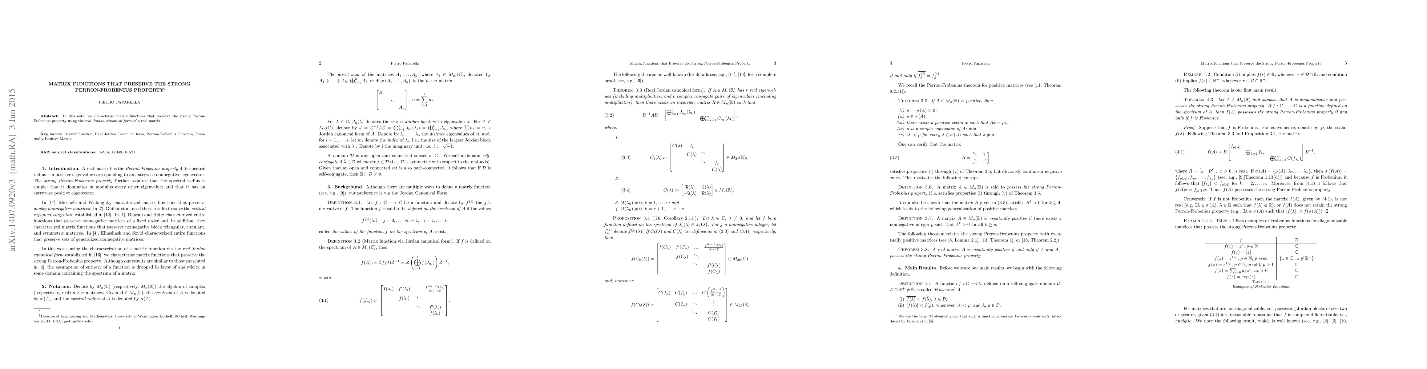 Researchers characterize matrix functions that preserve the strong Perron-Frobenius property using real Jordan canonical form, a key step towards understanding their implications in linear algebra and applications.