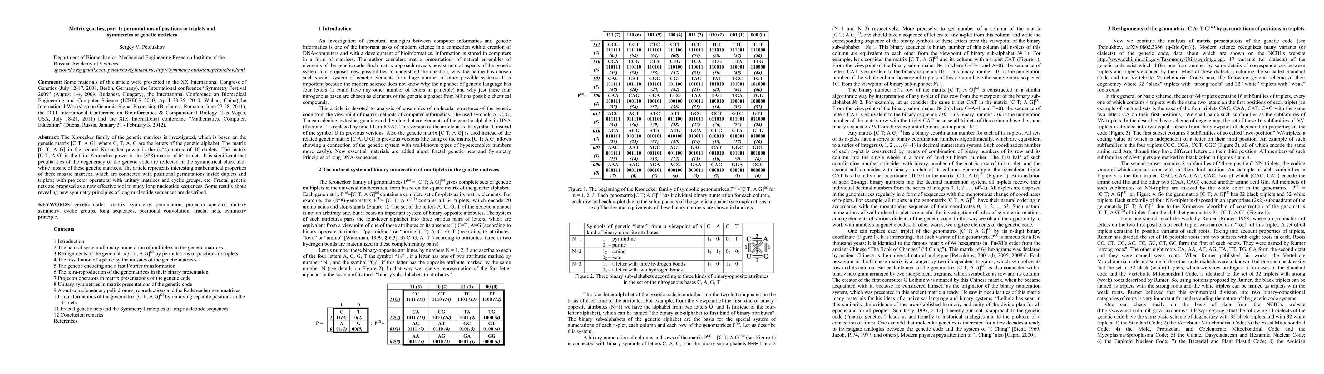 This paper explores the Kronecker family of genetic matrices, specifically the [C T; A G] matrix, and its higher powers, revealing symmetries and degeneracy in the genetic code through permutation and mathematical properties. It introduces fractal genetic nets as a novel tool for analyzing long nucleotide sequences and uncovers new symmetry principles.