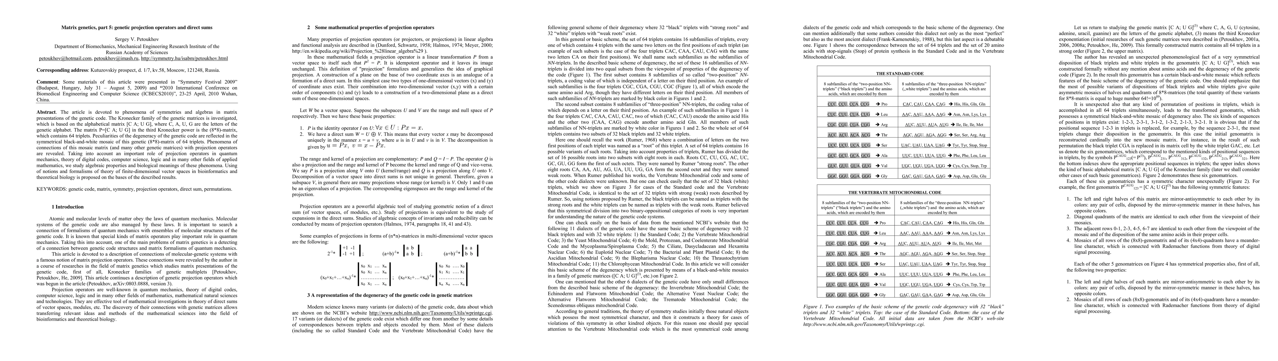 This paper explores symmetries and algebraic structures in matrix representations of the genetic code, focusing on the Kronecker family of genetic matrices. It investigates the matrix P, a (8*8)-matrix in the third Kronecker power, and examines its connection with projection operators, proposing a novel application of finite-dimensional vector space theory in bioinformatics and theoretical biology.