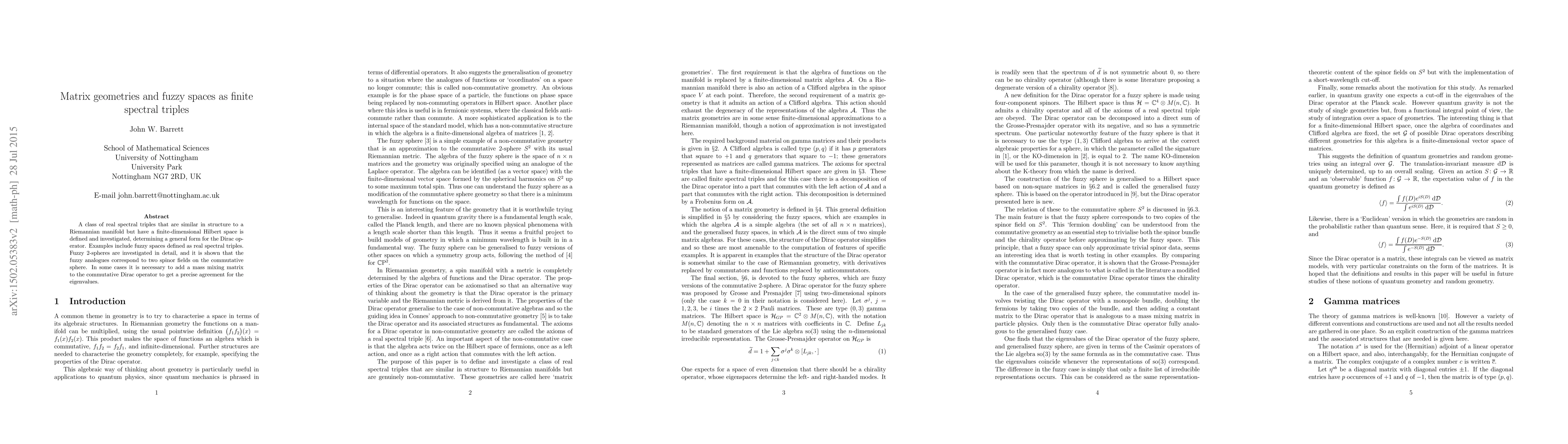A class of real spectral triples that are similar in structure to a Riemannian manifold but have a finite-dimensional Hilbert space is defined and investigated, determining a general form for the Dirac operator. Examples include fuzzy spaces defined as real spectral triples. Fuzzy 2-spheres are investigated in detail, and it is shown that the fuzzy analogues correspond to two spinor fields on the commutative sphere. In some cases it is necessary to add a mass mixing matrix to the commutative Dirac operator to get a precise agreement for the eigenvalues.