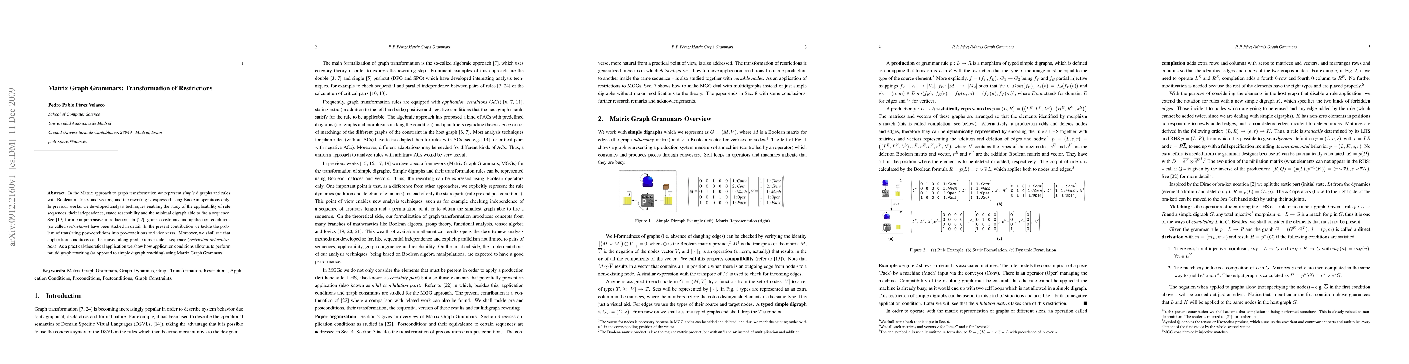 In the Matrix approach to graph transformation we represent simple digraphs and rules with Boolean matrices and vectors, and the rewriting is expressed using Boolean operations only. In previous works, we developed analysis techniques enabling the study of the applicability of rule sequences, their independence, stated reachability and the minimal digraph able to fire a sequence. In [20], graph constraints and application conditions (so-called restrictions) have been studied in detail. In the present contribution we tackle the problem of translating post-conditions into pre-conditions and vice versa. Moreover, we shall see that application conditions can be moved along productions inside a sequence (restriction delocalization). As a practical-theoretical application we show how application conditions allow us to perform multidigraph rewriting (as opposed to simple digraph rewriting) using Matrix Graph Grammars