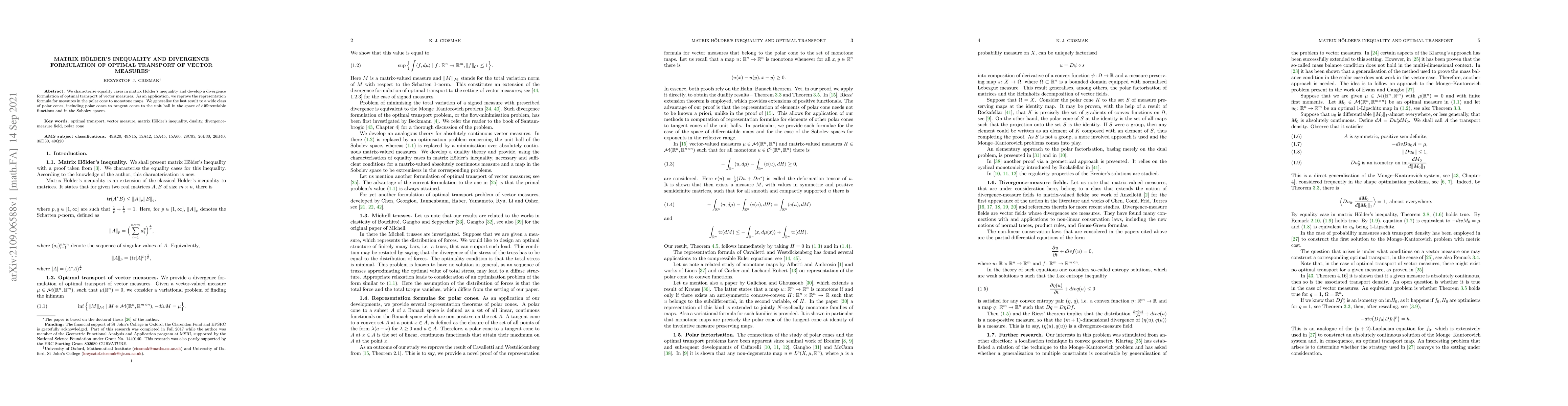 Summary: This paper characterizes equality cases in matrix Hölder's inequality and introduces a divergence formulation for optimal transport of vector measures, applying these results to reprove and generalize measure representations in polar cones, especially for monotone maps and in Sobolev spaces.