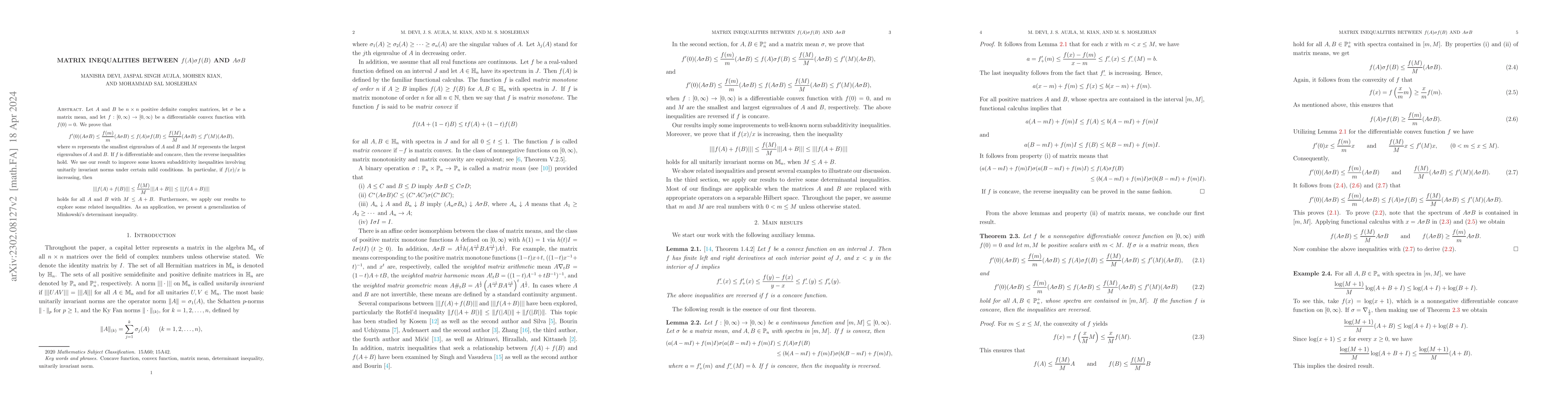 This paper investigates matrix inequalities involving differentiable convex functions applied to positive definite matrices and matrix means. It establishes bounds relating $f(A)\sigma f(B)$ to $A\sigma B$ using the eigenvalues of $A$ and $B$, and applies these results to improve known subadditivity inequalities and generalize Minkowski's determinant inequality.