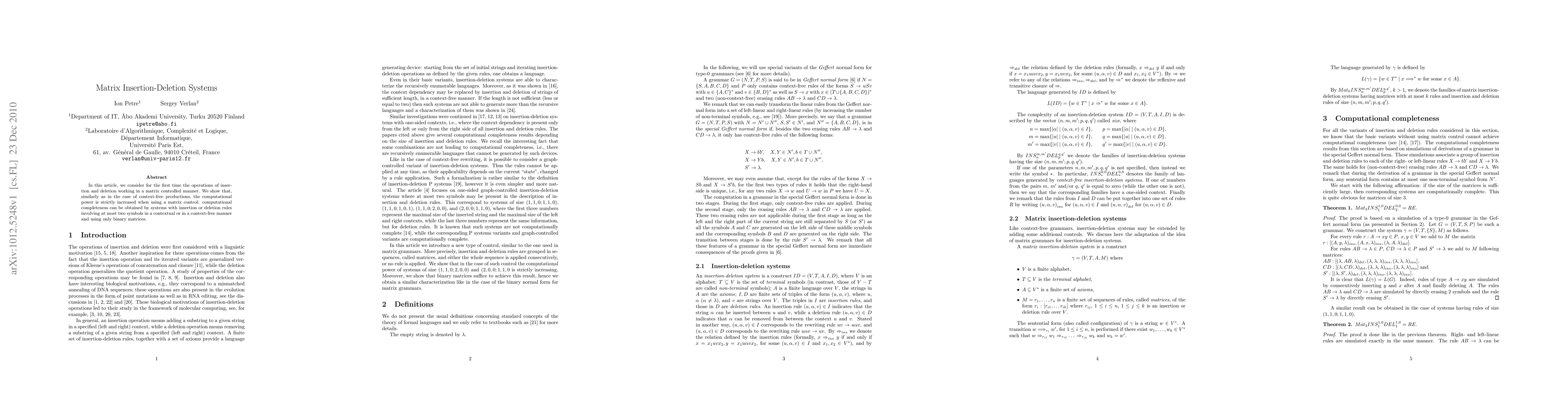This paper introduces matrix insertion-deletion systems, demonstrating that using matrix control for these operations enhances computational power, achieving completeness with systems employing binary matrices and rules involving at most two symbols.