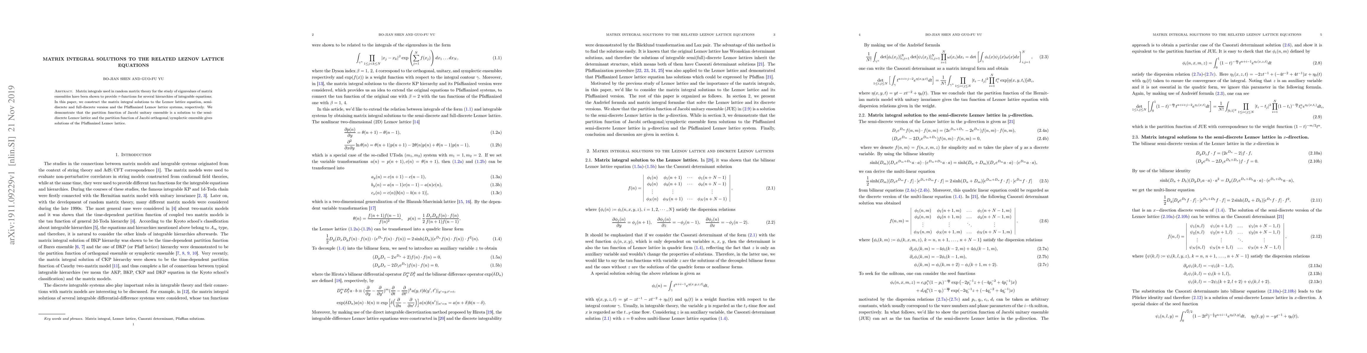 Matrix integrals used in random matrix theory for the study of eigenvalues of matrix ensembles have been shown to provide $ \tau $-functions for several hierarchies of integrable equations. In this paper, we construct the matrix integral solutions to the Leznov lattice equation, semi-discrete and full-discrete version and the Pfaffianized Leznov lattice systems, respectively. We demonstrate that the partition function of Jacobi unitary ensemble is a solution to the semi-discrete Leznov lattice and the partition function of Jacobi orthogonal/symplectic ensemble gives solutions of the Pfaffianized Leznov lattice.