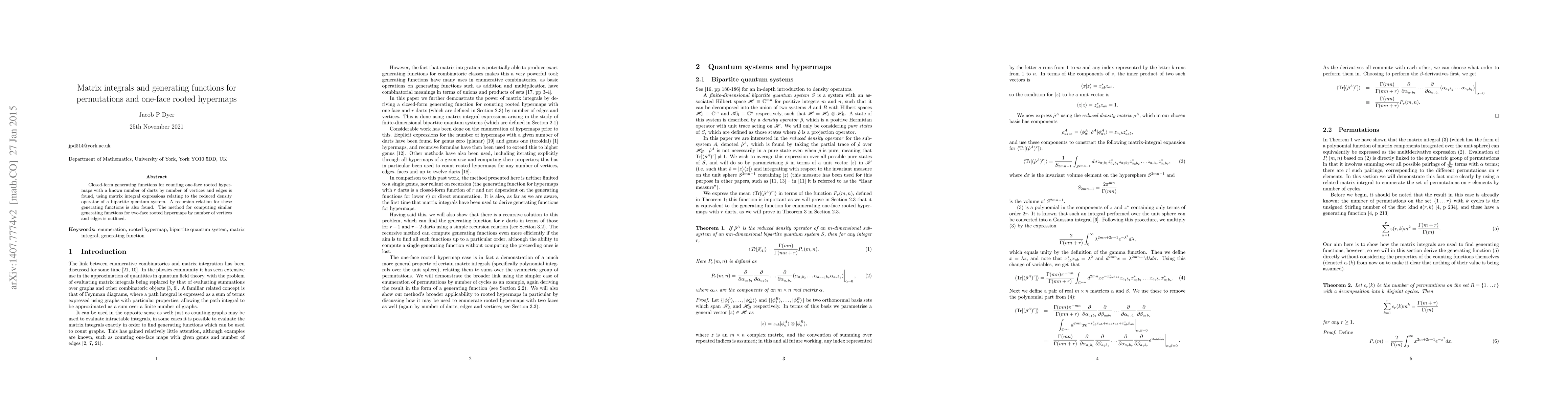Closed-form generating functions for counting one-face rooted hypermaps with a known number of darts by number of vertices and edges is found, using matrix integral expressions relating to the reduced density operator of a bipartite quantum system. A recursion relation for these generating functions is also found. The method for computing similar generating functions for two-face rooted hypermaps by number of vertices and edges is outlined.