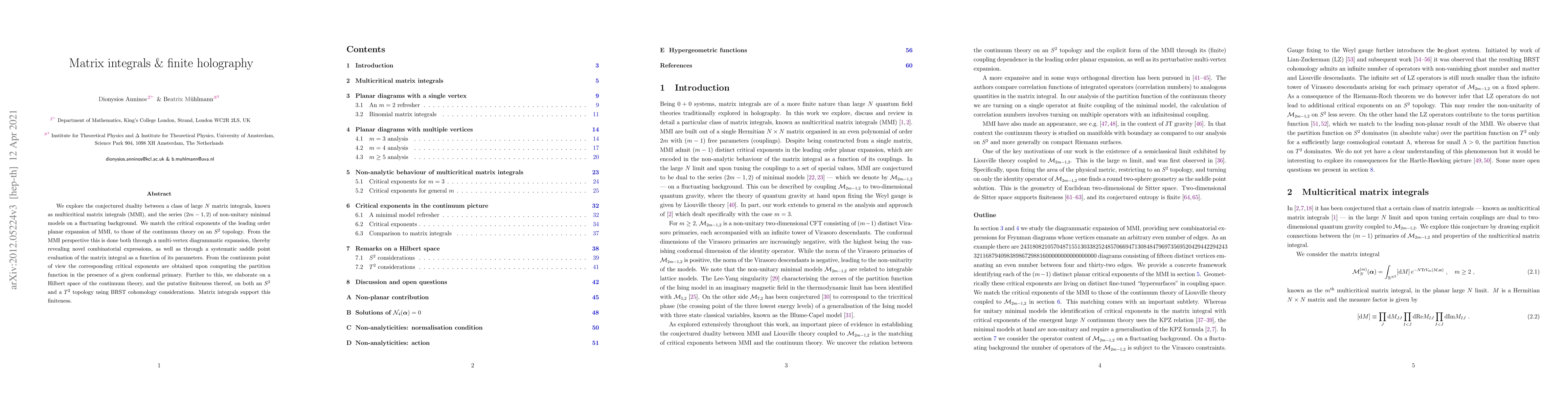We explore the conjectured duality between a class of large $N$ matrix integrals, known as multicritical matrix integrals (MMI), and the series $(2m-1,2)$ of non-unitary minimal models on a fluctuating background. We match the critical exponents of the leading order planar expansion of MMI, to those of the continuum theory on an $S^2$ topology. From the MMI perspective this is done both through a multi-vertex diagrammatic expansion, thereby revealing novel combinatorial expressions, as well as through a systematic saddle point evaluation of the matrix integral as a function of its parameters. From the continuum point of view the corresponding critical exponents are obtained upon computing the partition function in the presence of a given conformal primary. Further to this, we elaborate on a Hilbert space of the continuum theory, and the putative finiteness thereof, on both an $S^2$ and a $T^2$ topology using BRST cohomology considerations. Matrix integrals support this finiteness.
