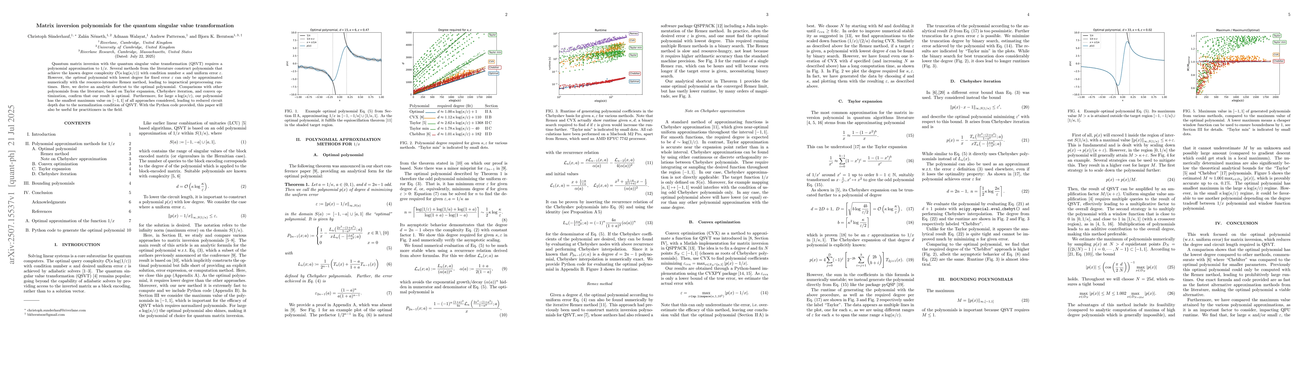 Quantum matrix inversion with the quantum singular value transformation (QSVT) requires a polynomial approximation to $1/x$. Several methods from the literature construct polynomials that achieve the known degree complexity $\mathcal{O}(\kappa\log(\kappa/\varepsilon))$ with condition number $\kappa$ and uniform error $\varepsilon$. However, the \emph{optimal} polynomial with lowest degree for fixed error $\varepsilon$ can only be approximated numerically with the resource-intensive Remez method, leading to impractical preprocessing runtimes. Here, we derive an analytic shortcut to the optimal polynomial. Comparisons with other polynomials from the literature, based on Taylor expansion, Chebyshev iteration, and convex optimization, confirm that our result is optimal. Furthermore, for large $\kappa\log(\kappa/\varepsilon)$, our polynomial has the smallest maximum value on $[-1,1]$ of all approaches considered, leading to reduced circuit depth due to the normalization condition of QSVT. With the Python code provided, this paper will also be useful for practitioners in the field.