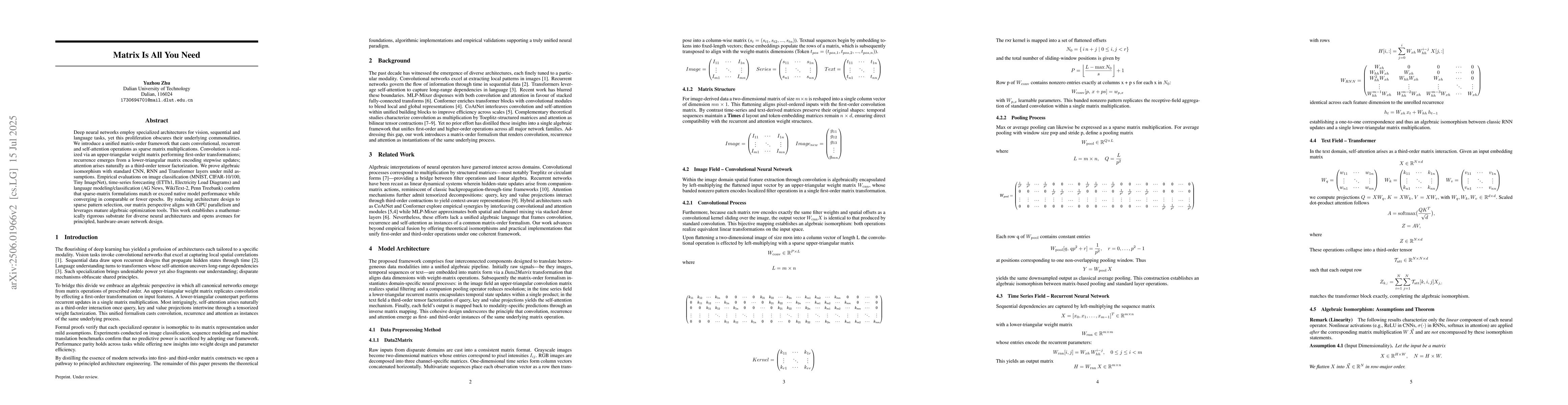 Deep neural networks employ specialized architectures for vision, sequential and language tasks, yet this proliferation obscures their underlying commonalities. We introduce a unified matrix-order framework that casts convolutional, recurrent and self-attention operations as sparse matrix multiplications. Convolution is realized via an upper-triangular weight matrix performing first-order transformations; recurrence emerges from a lower-triangular matrix encoding stepwise updates; attention arises naturally as a third-order tensor factorization. We prove algebraic isomorphism with standard CNN, RNN and Transformer layers under mild assumptions. Empirical evaluations on image classification (MNIST, CIFAR-10/100, Tiny ImageNet), time-series forecasting (ETTh1, Electricity Load Diagrams) and language modeling/classification (AG News, WikiText-2, Penn Treebank) confirm that sparse-matrix formulations match or exceed native model performance while converging in comparable or fewer epochs. By reducing architecture design to sparse pattern selection, our matrix perspective aligns with GPU parallelism and leverages mature algebraic optimization tools. This work establishes a mathematically rigorous substrate for diverse neural architectures and opens avenues for principled, hardware-aware network design.