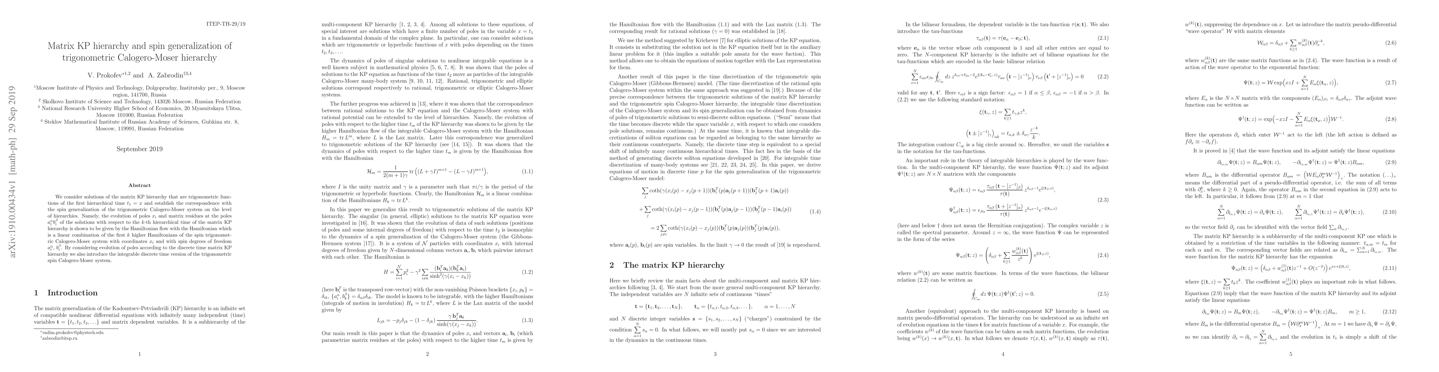 The paper establishes a correspondence between the matrix KP hierarchy and the spin generalization of the trigonometric Calogero-Moser hierarchy, showing that their evolutions are Hamiltonian flows with a specific Hamiltonian structure. Additionally, it introduces a discrete integrable version of the spin Calogero-Moser system based on the matrix KP hierarchy.
