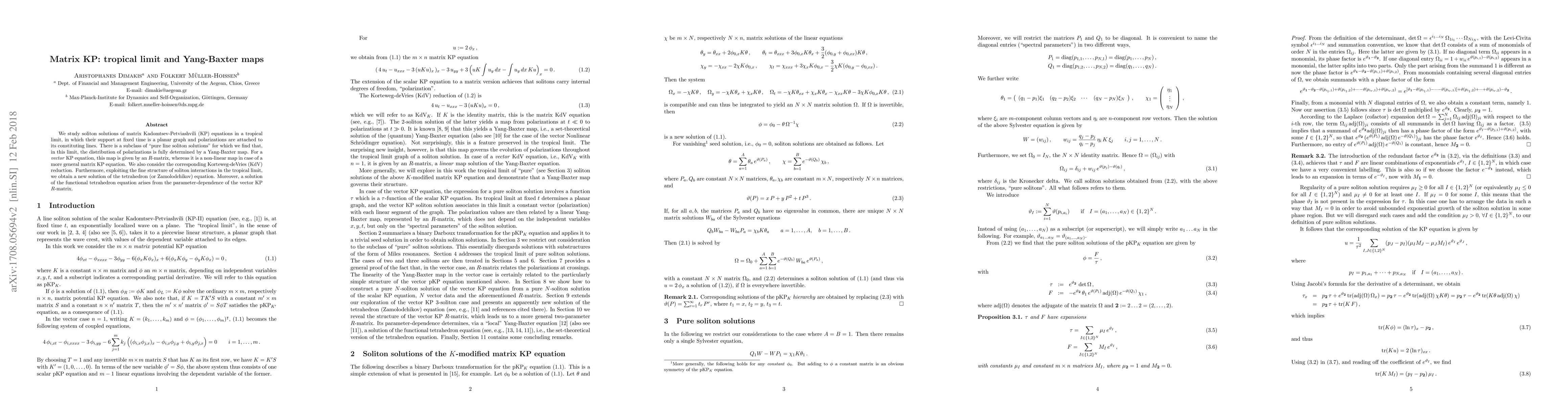 This paper investigates soliton solutions of matrix Kadomtsev-Petviashvili (KP) equations in a tropical limit, revealing that polarizations in "pure line soliton solutions" are determined by a Yang-Baxter map, which is an R-matrix for vector KP equations and a non-linear map for general matrix KP equations. It also explores the corresponding Korteweg-deVries (KdV) reduction and derives new solutions of the tetrahedron and functional tetrahedron equations.