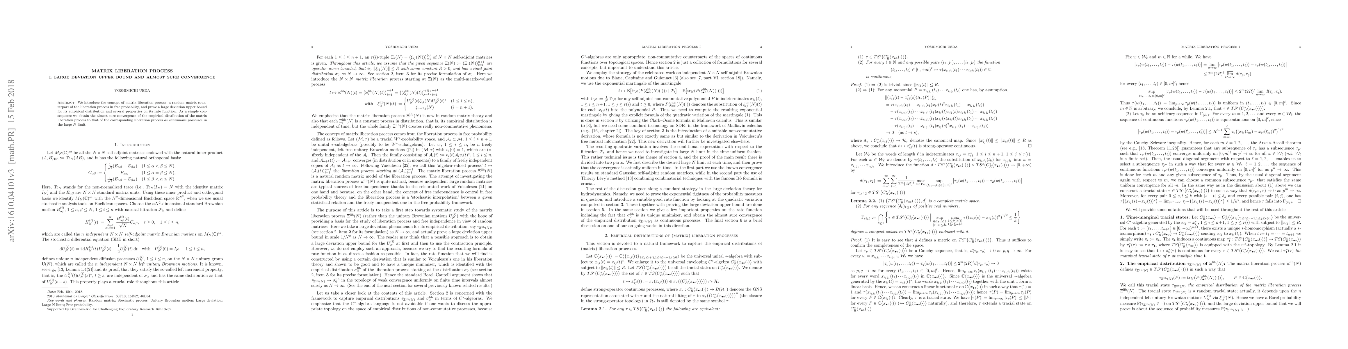 The paper introduces the matrix liberation process, a random matrix analogue of the liberation process in free probability. It proves a large deviation upper bound for the empirical distribution, demonstrating almost sure convergence to the liberation process's distribution in the large N limit.