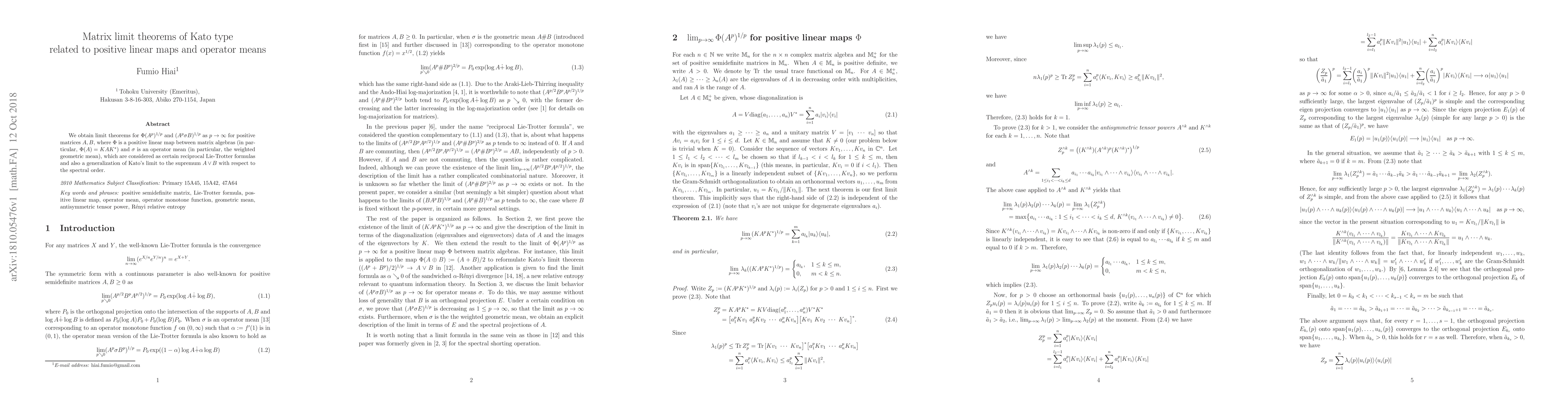 We obtain limit theorems for $\Phi(A^p)^{1/p}$ and $(A^p\sigma B)^{1/p}$ as $p\to\infty$ for positive matrices $A,B$, where $\Phi$ is a positive linear map between matrix algebras (in particular, $\Phi(A)=KAK^*$) and $\sigma$ is an operator mean (in particular, the weighted geometric mean), which are considered as certain reciprocal Lie-Trotter formulas and also a generalization of Kato's limit to the supremum $A\vee B$ with respect to the spectral order.