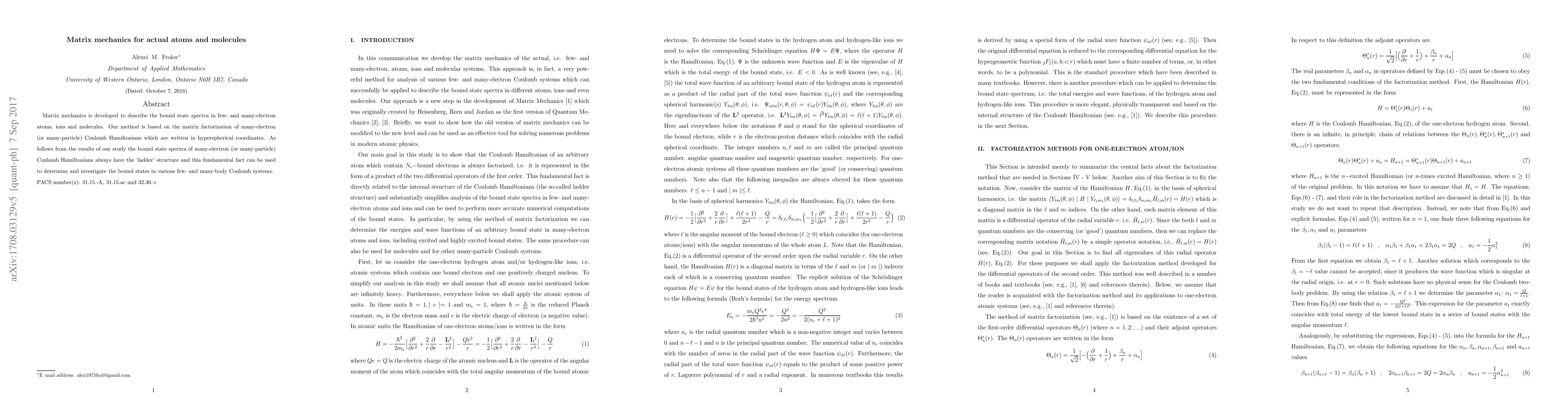 This paper develops matrix mechanics to analyze the bound state spectra of few- and many-electron atoms, ions, and molecules, utilizing matrix factorization of Coulomb Hamiltonians in hyperspherical coordinates. The study reveals a consistent 'ladder' structure in the spectra, providing a method for determining and investigating bound states in various Coulomb systems.