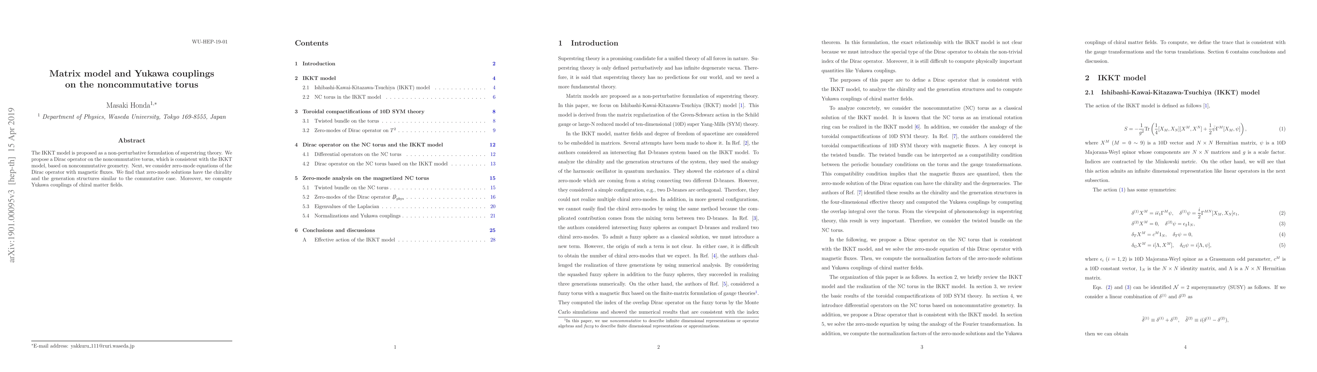 The IKKT model is proposed as a non-perturbative formulation of superstring theory. We propose a Dirac operator on the noncommutative torus,which is consistent with the IKKT model, based on noncommutative geometry. Next, we consider zero-mode equations of the Dirac operator with magnetic fluxes. We find that zero-mode solutions have the chirality and the generation structures similar to the commutative case. Moreover, we compute Yukawa couplings of chiral matter fields.