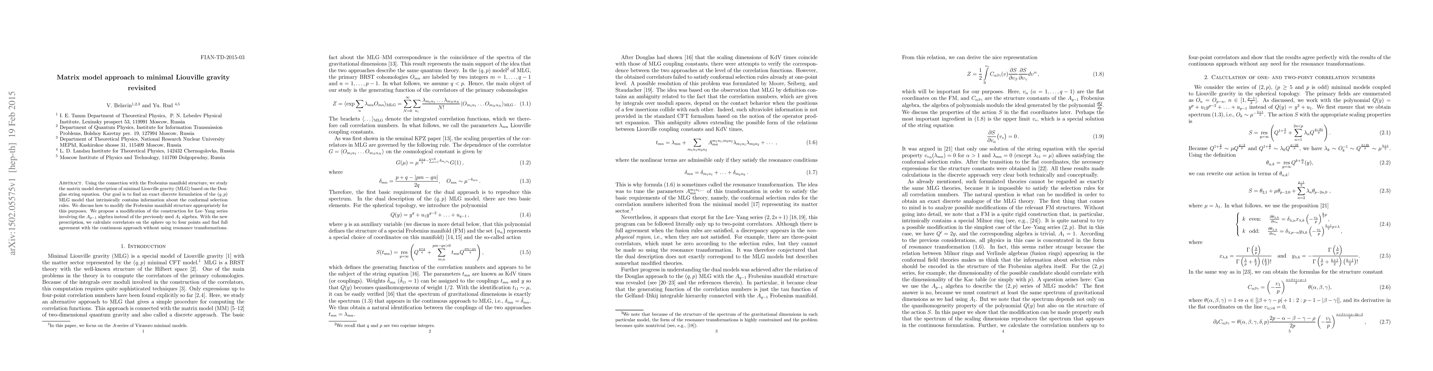 Using the connection with the Frobenius manifold structure, we study the matrix model description of minimal Liouville gravity (MLG) based on the Douglas string equation. Our goal is to find an exact discrete formulation of the (q,p) MLG model that intrinsically contains information about the conformal selection rules. We discuss how to modify the Frobenius manifold structure appropriately for this purposes. We propose a modification of the construction for Lee-Yang series involving the $A_{p-1}$ algebra instead of the previously used $A_1$ algebra. With the new prescription, we calculate correlators on the sphere up to four points and find full agreement with the continuous approach without using resonance transformations.