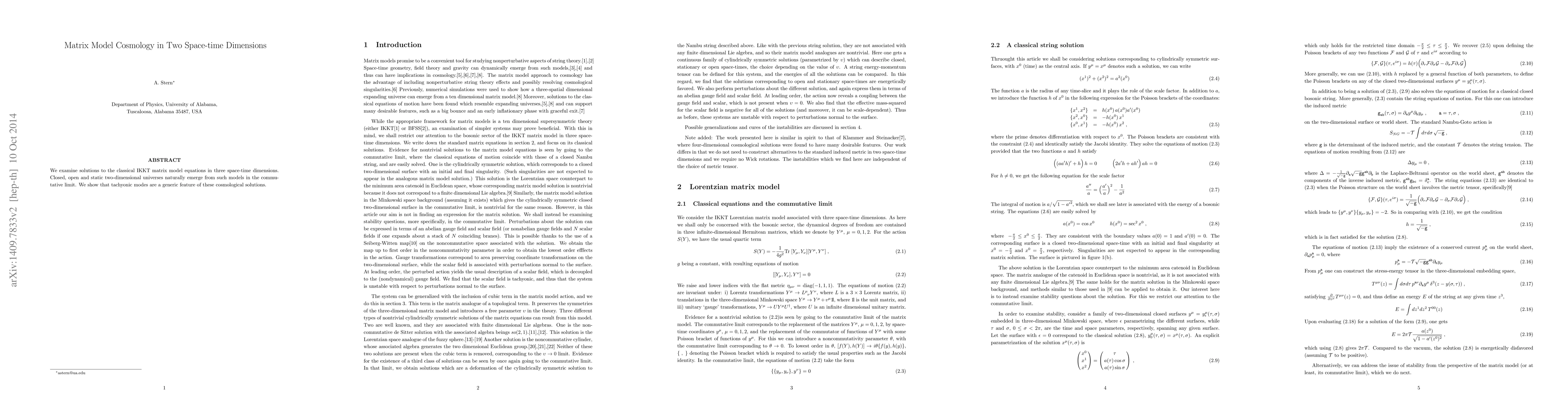 Summary: This paper explores solutions to the IKKT matrix model in three dimensions, revealing the emergence of two-dimensional universes and identifying tachyonic modes as a common feature in these cosmological solutions.